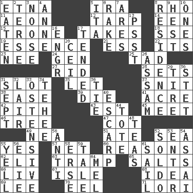 ACROSS 1. Inactive volcano in Sicily 5. Lyricist Gershwin 8. 17th letter of the Greek alphabet 11. A really long time 12. Canvas cover 14. Car or cant ending 15. Heavy duty weighing machine 17. Receives possession of 18. Compass dir. 19. Substance 21. Double-curved letter 22. It is 23. Born 24. Commissioned military rank (abbr.) 25. Small amount or degree 27. To free from 28. Puts into a specified state 31. Narrow opening 35. Allow 37. In a ____ (agitated or irritated) 38. Comfort 39. Pass on 41. Measure of real estate 42. Heart or essence 43. Eastern Standard Time (abbr.) 45. Rendezvous 46. Woody plant 47. Small bed 49. Teachers' org. 51. Had dinner 52. Ocean 55. Consenting reply 57. Remaining after all deductions 60. Thinks logically 62. Biblical high priest 63. _____ steamer (cargo ship) 65. Table seasonings 66. 54 in ancient Rome 67. Capri or Wight 68. The content of cognition 69. Area sheltered from the wind 70. Snakelike fish 71. Australian parrot (variant) DOWN 1. Eroded 2. Laconic 3. Trap for birds or small mammals 4. Singer Murray 5. Call ___ day 6. Immoral or dissolute person 7. Ancient Greek god of war 8. Home 9. Behest 10. Washington bills 13. Inconspicuous attention getter 16. Engineer (abbr.) 17. Watched over 20. To provide with a ceiling 26. Indian state 29. Become fatigued 30. Proofreading order 31. Back-to-school mo. 32. Den 33. Clearly or manifestly demonstrative 34. Giggle 36. Neckwear 40. Fortification 44. Haul 48. Afternoon social gatherings 50. Against 52. Twentieth part of a lira 53. Keyboard key 54. Slender Brazilian palm 55. Shout 56. Writer Wiesel 58. Celtic language 59. Lie 61. Travel by water 64. Cartoonist voice _ Blanc