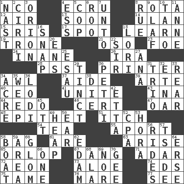 ACROSS 1. Non-commissioned officer (abbr.) 4. Shade of tan 8. Round or rotation of duties 12. Atmosphere 13. Within a short period 14. Uhlan (variant) 15. Indian titles of respect 17. Specific locale 18. Acquire or gain knowledge or skills 19. Marketplace scale 21. Bear (Spanish) 23. Enemy 24. Lacking in sense or substance 26. Retirement account (abbr.) 28. Inconspicuous attention getter 30. Hard copy producer 34. Leather borer 37. Assistant 39. Johnson of "Laugh-In" 40. Corporate head (abbr.) 41. Join together 43. _ tizzy (2 wds.) 44. Make new 46. Foregone conclusion 47. Rowing implement 48. Curse 51. Hankering 54. Afternoon social gathering 55. To the left, to Queeg 58. Paper or plastic container 61. "We ___ not amused" (Victoria) 63. Ascend 65. Fourth or lowest deck 67. Mild oath, euphamism for damn 71. The sixth month of the Jewish calendar 72. Period of immesurable duration 73. _ vera 74. Begley and Asner 75. Docile 76. Female horse 77. Observe DOWN 1. Political cartoonist Thomas 2. High-altitude cloud 3. Greek mythologigal hunter 4. Double-curved letter 5. Police officer (slang) 6. Friend of Pooh 7. To (old English) 8. Sorrow 9. Norwegian king 10. Pacific island yam 11. Singer Murray 16. Fastener 18. Australian parrot (variant) 20. Followers of ems 22. Title for a knight 25. Son of Isaac 27. Santa ___, CA 29. Tinged 30. _ dish (used to culture cells) 31. Musical group of three 32. Inactive volcano in Sicily 33. Posterior 34. 1/640 square mile 35. Shed a tear 36. Farming town in central California 38. Expire 42. Singer James 45. Baseball player Mel 49. Pile 50. Ewer handle 52. Accounting whiz (abbr.) 53. Israeli folk dance 56. Amusement-park features 57. Sadhe (variant) 58. Water vessel 59. Type of rug 60. Take by theft 62. Dutch treat 64. Celtic language 66. Single 68. Wing 69. Not either 70. Turn to the right
