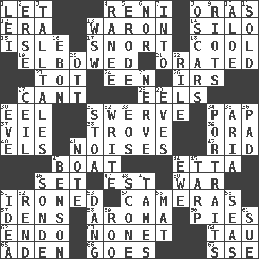 ACROSS 1. Allow 4. Painter Guido (1575-1642) 8. Mouths or openings 12. Period 13. Make _____ (do battle with) 14. Grain storage tower 15. Capri or Wight 17. Derisive sound 18. Calm and collected 19. Turned at an angle; bent 21. Declaimed 23. Small child 24. Car or cant ending 26. Big collection agency 27. Patter 28. Snakelike fish 30. Snakelike fish 31. Turn aside suddenly 34. Infant food 37. Compete 38. Collection of objects 39. Mouth or opening 40. Raised railways 41. Annoying sounds 42. To free from 43. Water vessel 44. Singer James 46. Put into a specified state 47. Eastern Standard Time (abbr.) 50. Armed conflict 51. Pressed 54. Devices for capturing images 57. Hiding places for outlaws 58. Odor 60. Sliced desserts 62. Inside; within (prefix) 63. Music written for nine 64. The 19th letter of the Greek alphabet 65. Arabian gulf 66. Travels 67. Compass dir. DOWN 1. Luau accessory 2. Celtic language 3. Baron Munchausen's specialties 4. Indian princess (variant) 5. Wear away 6. And not 7. To the inside or interior of 8. Motion picture awards 9. Debaucheries 10. Medicinal plant 11. Disposed of to a purchaser 13. Compass dir. 16. Inky black, to poets 20. Baseball player Mel 22. Cause heat under the collar 25. Impudent aggressiveness 27. To provide with a ceiling 29. Nights before holidays 30. Night before a holiday 31. Portico 32. Compose 33. Greek goddess of the dawn 34. Likenesses of persons 35. Operatic vocal solo 36. Writing tablet 41. Brief written record 43. Gillaume's butler role 44. She-sheep 45. Canvas cover 46. Message 48. Biscuitlike quick bread 49. Corrects by punishment or discipline 51. The content of cognition 52. Tear apart 53. Mild oath, euphamism for damn 55. Floor protector 56. Oceans 59. Friend of Pooh 61. Take to court
