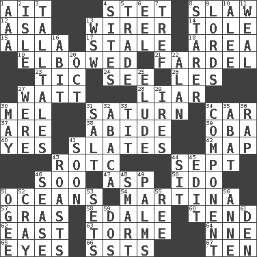 ACROSS 1. Small island 4. Proofreading order 8. Cole _ (cabbage dish) 12. White ___ sheet 13. One who wires 14. Lacquered or enameled metalware 15. Silent film actress Nazimova 17. Having lost freshness 18. Length times width 19. Shoved, as through a crowd 21. Burden 23. Nervous spasm 24. Perceive with the eye 26. French article 27. Electrical Unit 28. One who doesn't tell the truth 30. Cartoonist voice _ Blanc 31. Titan orbits this 34. 4-wheeled motor vehicle 37. "We ___ not amused" (Victoria) 38. Tolerate 39. Chief or king in Benin or Nigeria 40. Consenting reply 41. Chalkboards 42. Atlas unit 43. College mil. group 44. Back-to-school mo. 46. "Barney Miller" actor Jack 47. Cleo's killer 50. Wedding promise 51. Seas 54. Chrissie's court nemesis 57. Pate de foie ____ 58. Peak District village in England 60. Watch over 62. Compass direction 63. Singer Mel 64. Compass dir. 65. Sight organs 66. Fast planes 67. "___ Little Indians" DOWN 1. Auto club (abbr.) 2. Capri or Wight 3. Baron Munchausen's specialties 4. Locates 5. Exchange 6. Snakelike fish 7. Not kosher 8. A viewer who gazes fixedly 9. Domineers 10. Toward shelter 11. Welt 13. Compass dir. 16. "This won't hurt ____!" 20. Sep. follower 22. ____ Jay Lerner 25. Dodge 27. Past tense of be (plural) 29. Angers 30. Fifth month 31. Table seasoning 32. Phillipine bananalike plant 33. Teat (slang) 34. Part 35. Blind as ____ 36. Strike 41. Within a short period 43. Exposes to great heat 44. Be seated 45. Prepare for publication 46. Gospel singer Marvin 48. Don Adams' spy role 49. Insides of hands 51. Double curve, resembling the letter S 52. Supercomputer manufacturer 53. Puts into a specified state 55. To riddle 56. Singer Murray 59. Two (Sp.) 61. Lair