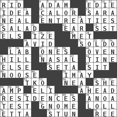 ACROSS 1. To free from 4. First man 8. Singer Brickell 12. The main thing one is thinking about 14. Bodily heat indicating an inflammation 16. "Two Mules for Sister ____" 17. Anneal 18. Pleas 20. First course 22. Hearing organ 23. Fast jet (abbr.) 24. Raised railways 25. Ending with capital 28. Was introduced to 30. Enthusiastic 31. Twentieth part of a lira 35. Experiment locale 37. Singles 40. Baking chamber 41. Land elevation 42. Relating to the nose 44. Prong on a fork 45. Otherwise 46. Bristle 47. Be seated 48. Trap for birds or small mammals 50. "If ____ say so..." 52. Ring climax 54. Teachers' org. 55. A female animal or person 58. Electrical Unit 61. Connecticut Ivy Leaguer 63. Having the leading position 65. Homes 70. Small Philippine buffalo 71. Trial 72. Dwarf 73. Hang loosely or laxly 74. Singer James 75. Make senseless or dizzy 76. Portuguese money of account (variant) DOWN 1. Remove soap 2. Perfect 3. Allots cards 4. Adept person 5. Daniel's nick name 6. The first octave above the treble staff 7. Greater amount 8. Eastern Standard Time (abbr.) 9. Raised platform 10. Angers 11. 90 degrees 13. In the manner of 15. 480, 500 or 516 sheets of paper 19. Ancient Greek god of war 21. HTML Container Element 26. The Jewish people; Israel 27. Ferber et al. 29. A girl or young woman (variant) 30. Most capable 32. 57 in ancient Rome 33. Undesirable depression on a surface 34. Single 35. _ and Stitch 36. In addition 38. Compass dir. 39. Smooth fabric 41. Layer 43. Unable to walk 49. Supplemented with great effort 51. Auto club (abbr.) 53. Cassini of fashion 55. Sir (Sp.) 56. White Person, in Hawaii 57. Peak District village in England 58. Johnson of "Laugh-In" 59. Rendezvous 60. Inconspicuous attention getter 62. Taverns 64. Actor Linden 66. Call ___ day 67. Small bed 68. Australian flightless bird 69. Elected rep.