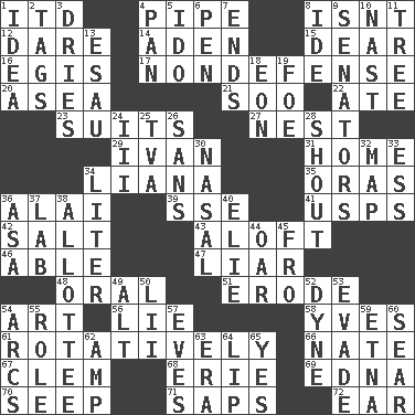 ACROSS 1. It would 4. Corncob 8. Is not 12. Have the gumption 14. Arabian gulf 15. Letter starter 16. The front part of a cuirass 17. Unrelated to defense, as in spending 20. Toward the sea 21. "Barney Miller" actor Jack 22. Had dinner 23. Costumes for special activities 27. A home for chicks 29. _ the terrible 31. Residence 34. Climbing, woody, usually tropical vines 35. Mouths or openings 36. Jai ____ 39. Compass dir. 41. United States Postal Service (abbr.) 42. Table seasoning 43. High up in or into the air 46. Competent 47. One who doesn't tell the truth 48. Spoken 51. Wear away 54. Tate display 56. Untruth 58. Jacques Cousteau's middle name 61. Producing rotation 66. Nathan's nickname 67. Clement's nick name 68. 4th largest of the Great Lakes 69. Pulitzer Prize-winning author Ferber 70. Ooze 71. Plant excrements 72. Ewer handle DOWN 1. The main thing one is thinking about 2. Labels 3. Frees from moisture 4. Baking dish 5. Wedding promise 6. Fenced enclosure 7. Extremities 8. Binary compound 9. Elected representatives 10. Political cartoonist Thomas 11. Woody plant 13. Son of Isaac 18. A really long time 19. Enemy 24. One more than two 25. Federal power corp. 26. Without 28. Yell 30. Relating to the nose 32. Atlas unit 33. Double-curved letter 34. 61 cubic inches 36. White ___ sheet 37. Experiment locale 38. One to whom something is allotted 40. Writer Wiesel 44. Boat paddle 45. Away 49. The first octave above the treble staff 50. Cards in a Roman deck? 52. Unit of force 53. Elude 54. Arches 55. Hero or heavy, e.g. 57. Nights before holidays 59. Inactive volcano in Sicily 60. Shrivel 62. Electrical Unit 63. Period 64. Mouth edge 65. Consenting reply