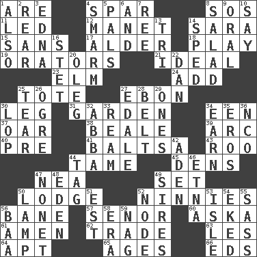 ACROSS 1. "We ___ not amused" (Victoria) 4. Practice fight 8. Mayday 11. Directed 12. French painter Edouard 14. "Two Mules for Sister ____" 15. Without 17. Tree or shrub in the Birch family 18. Shaw product 19. Speakers 21. Standard of perfection 23. Shade tree 24. Find the sum of 25. Carryall 27. Inky black, to poets 30. Part of a journey 31. Place where plants grow 34. Car or cant ending 37. Rowing implement 38. Calif. Air Force Base 39. Curve 40. Before (prefix) 41. Greek mezzo-soprano Agnes 43. Friend of Pooh 44. Docile 45. Habitations of wild animals 47. Teachers' org. 49. Arrange properly for use 50. Inn 52. Simpletons 56. Object of repulsion 57. Sir (Sp.) 60. "____ silly question..." 61. So be it 62. Swap 63. French article 64. Fitting 65. Grows older 66. Begley and Asner DOWN 1. In addition 2. Stern 3. Pulitzer Prize-winning author Ferber 4. Excessive but superficial compliments 5. Friends 6. Plus 7. To sift 8. First course 9. Taken by mouth 10. Declare 13. Three (prefix) 14. Moved rapidly 16. Proofreading order 20. Cassini of fashion 22. Daniel's nick name 25. Lacerate 26. Legendary monster 27. Peak District village in England 28. Waist strap 29. Washington bills 30. Chop off 32. Swedish rock group 33. 480, 500 or 516 sheets of paper 34. Merit 35. Greek god of love 36. Non-commissioned officer (abbr.) 42. An important port of Yemen 44. Label 46. Inactive volcano in Sicily 47. Music written for nine 48. Paradise 49. Begets 50. Desk light 51. Eastern Standard Time (abbr.) 52. Connecting point 53. Capri or Wight 54. Made supply last 55. Backtalk 56. Sound made by sheep 58. Epoch 59. Tired old horse