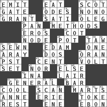 ACROSS 1. Send forth 5. Erode 8. Native of Scotland 12. Yard entry 13. Lyric poems 15. Words to Nanette 16. Monetary aid 18. Suttee (variant) 19. Cassini of fashion 20. Baking dish 22. Modes 24. Greek god of love 26. Small bed 27. Connecting point 28. Cooking vessel 29. The 23rd letter of the Hebrew alphabet 32. Stitched 35. Dutch treat 37. Single 38. Like ___ of sunshine 39. Two (Sp.) 40. Northwest Algerian city 41. Pacific Standard Time (abbr.) 42. Penny 43. Electrical Unit 44. Arrange properly for use 45. Not either 46. Otherwise 49. _ tizzy (2 wds.) 50. Den 51. Commissioned military rank 55. Drinking establishment 56. Calm and collected 57. Examine hastily 59. Shops 63. Singer Murray 64. One of the Great Lakes 65. Puff or smoke 66. Remainder 67. Compass dir. 68. Inky black, to poets DOWN 1. Ovum 2. Third mo. 3. Call ___ day 4. 3-inch nail 5. Greek goddess of the dawn 6. First man 7. Wig 8. Snob 9. Having a low temperature 10. Singles 11. Coat; cloak 14. "Cheers" or "Ellen" 17. Pacific island yam 21. Dreamland 23. Being at a high temperature 25. Sowing specialist 28. Soft color 29. "Corrida" creature 30. Of or related to the anus 31. Left 32. Plant excrements 33. Celtic language 34. Electrical Unit 36. Spanish title 40. Make much ado about nothing 42. Rough 45. Compass dir. 47. Experiment locale 48. Thailand, formerly 49. An arm off of a larger body of water 51. Went 52. Immeasurably long periods of time 53. Measure of real estate 54. (Had) reclined 56. Auto 58. Born 60. Director Reiner 61. Ring climax 62. Elected rep.