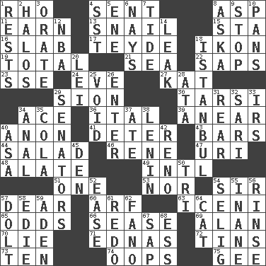 ACROSS 1. 17th letter of the Greek alphabet 4. Posted 8. Viper 11. Merit 13. Slow-paced one 15. R.R. building 16. Broad, flat, thick piece 17. Miss Universe 1986, Barbara Palacios _ 18. Picture 19. "_____ Recall" 21. Ocean 22. Plant excrements 23. Compass dir. 24. Night before a holiday 27. Krazy ___ of comics 29. The Jewish people; Israel 30. Tarsus (plural) 34. Adept person 36. Slanted text style (abbr.) 39. Approach 40. Soon (poet.) 41. Prevent from occurring 43. Soap units 44. First course 46. French philosopher Descartes 47. RI univ. 48. Having winglike extensions 49. International (abbr.) 51. Single 53. Not either 54. Title for a knight 57. Letter starter 60. Sandy's bark 63. Ancient Celtic tribe of eastern Britain 65. Likelihood 66. Gospel singer Marvin 69. Actor Alda or Thicke 70. Untruth 71. Ferber et al. 72. Metal containers 73. "___ Little Indians" 74. I made a mistake 75. Unit of force equal to gravity DOWN 1. Musical pauses 2. Auras 3. Speak pompously 4. Fast jet (abbr.) 5. Compass dir. 6. Negative votes 7. Event that recurs at intervals 8. "____ silly question..." 9. Constrict 10. Zero-star reviews 12. Basketball assoc. 14. Path through which fluid escapes 18. Byzantium, centuries later 20. Flowery wreath 25. Lacking any legal or binding force 26. Keyboard key 28. "One Day ___ Time" 29. Legislators 31. Stern 32. Indian skirt 33. Big collection agency 34. Of or related to the anus 35. Root beer relative 37. Had dinner 38. Soviet premier 1918-24 40. White ___ sheet 42. Former U.S. Attorney General Janet 45. Lair 50. Three (prefix) 52. Comfort 54. Former Milwaukee Brewers owner Bud 55. Silly 56. Wash lightly 57. Stupid person 58. Singer Brickell 59. An important port of Yemen 61. Make new 62. Papal veil 64. Domesticated feline 67. Plant excrement 68. Double-curved letter