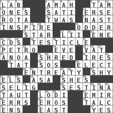 ACROSS 1. Experiment locale 4. Wet nurse 8. Scottish cap 11. Singles 13. Suttee (variant) 14. Celtic language 15. Roll call or roster of names 16. It was, poetically 17. Political cartoonist Thomas 18. Heighten or intensify 21. More peculiar 22. Play the lead 23. Cards in a Roman deck? 25. Compass dir. 26. Music discs 29. A testis 32. Stone: prefix 34. First lady 35. Large container 38. Small Philippine buffalo 39. Tear up 41. Angers 43. Make lace 44. Mayday 45. Voters do this 46. Plea 50. Like a shrinking violet 51. Raised railways 54. White ___ sheet 55. "______ My Girl" (Turtles hit) 57. Major League Baseball Commissioner Bud 59. French poetic form 63. Pulled tight 64. Farming town in central California 67. Arab leader 68. Blunders 69. Greek god of love 70. Baby powder 71. Followers of ems 72. Compass direction 73. Affirmative reply DOWN 1. Australian parrot (variant) 2. At once, immediately (arch.) 3. Stakes 4. Michaelmas daisies 5. Informal term for the mouth 6. "One Day ___ Time" 7. Part of HMS, perhaps 8. Buy and sell 9. NE Netherlands city 10. Distance measurement (Brit.) 12. Plant excrements 14. Conclusion 19. "Tell ____ the Marines!" 20. Actress Charlotte 21. Petroleum 23. Moving, as bait 24. On the rocks 26. Numbers guy (abbr.) 27. Gouge 28. Portico 30. Laconic 31. Tending to cause great harm 33. Assign a rank or rating to 36. Ancient Greek god of war 37. Technical work 39. Fast planes 40. Israeli folk dance 42. Filthy place 45. Sight organs 47. Tired old horse 48. Aid 49. Definite Article 51. First name in cosmetics 52. Memorize 53. Runs notes together 56. Proofreading order 58. ___ a Wonderful Life 60. "If ____ say so..." 61. "Death on the ____" 62. Arches 64. Area sheltered from the wind 65. Mouth or opening 66. Two (Sp.)