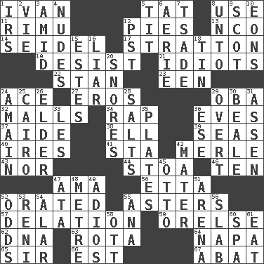 ACROSS 1. "Terrible" tsar 5. Make lace 8. Purpose 11. Tall New Zealand timber tree 12. Sliced desserts 13. Non-commissioned officer (abbr.) 14. A glass for beer 17. Ski resort town in Vermont 19. Cease 21. Foolish or stupid persons 22. Comedian Laurel of Laurel & Hardy 23. Car or cant ending 24. Adept person 27. Greek god of love 29. Chief or king in Benin or Nigeria 32. Promenades 34. Strike 36. Nights before holidays 37. Assistant 38. Pipe bend 39. Oceans 40. Angers 41. R.R. building 42. Haggard of country music 43. And not 44. Portico 46. "___ Little Indians" 47. Nursemaid (var.) 50. Singer James 52. Declaimed 55. Michaelmas daisies 57. Accusation by an informer 59. Threatening words 62. Heredity factor (abbr.) 63. Round or rotation of duties 64. California wine valley 65. Title for a knight 66. Eastern Standard Time (abbr.) 67. Blind as ____ DOWN 1. Big collection agency 2. Compete 3. Among 4. Unclothed pictures 5. Teat (slang) 6. Nest on high 7. Sadhe (variant) 8. To (old English) 9. Native of Scotland 10. Immeasurably long periods of time 12. Pacific Standard Time (abbr.) 15. _____ Park, CO 16. One who doesn't tell the truth 18. Shallow baking pan 20. Sounds asleep 24. With great haste 25. Capital of Egypt 26. A person who is older than you are 28. Table seasonings 29. Unconcealed 30. Calif. Air Force Base 31. NE Netherlands city 33. French article 35. Food holders 36. Compass dir. 42. Mother 45. Von Bismarck 47. "One Day ___ Time" 48. Distance measurement (Brit.) 49. Goodbye (Sp.) 51. Sports stadium 52. Likelihood 53. Painter Guido (1575-1642) 54. Having or resembling wings 55. Santa ___, CA 56. Thick slice 58. Baseball player Mel 60. Health resort 61. Erode