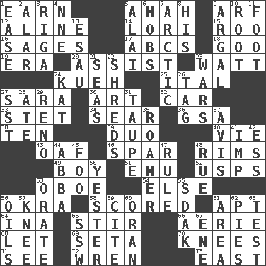 ACROSS 1. Merit 5. Wet nurse 9. Sandy's bark 12. Place in a line 14. Australian parrot (variant) 15. Friend of Pooh 16. Gurus 17. Lettered men learn these first 18. Thick or sticky substance 19. Period 20. Help 23. Electrical Unit 24. Malaysian steamed pastry 25. Slanted text style (abbr.) 27. "Two Mules for Sister ____" 30. Nonscientific branch of learning 32. Automobile 33. Proofreading order 34. Wither 36. Girls' org. (abbr.) 38. "___ Little Indians" 39. Superhero pair 40. Compete 43. Clumsy lout 46. Practice fight 48. Basketball hoops 49. Male child 51. Australian flightless bird 52. United States Postal Service (abbr.) 53. Mitch Miller's instrument 54. Otherwise 56. Gumbo ingredient 58. Tallied 61. Fitting 64. _ tizzy (2 wds.) 65. Commotion 66. Nest on high 68. Allow 69. Bristle 70. Leg joints 71. Observe 72. Songbird 73. Compass direction DOWN 1. Relaxation 2. Having or resembling wings 3. Capital of Latvia 4. Compass dir. 5. Jai _ 6. Crowds into 7. Northern region 8. Part of HMS, perhaps 9. Therefore, facetiously 10. Carrot, for example 11. One third of a yard 13. Son of Isaac 21. Oceans 22. Tears up 23. Armed conflicts 24. Krazy ___ of comics 26. Label 27. Fast jet (abbr.) 28. Had dinner 29. Former U.S. Attorney General Janet 31. Grayish beige 35. Nomad 37. Advice 41. Mischievous child 42. Double-curved letter 44. Swedish rock group 45. Egg _ yung 47. General guideline 48. Regret 50. Last past 53. Declaim 55. Neighbor of Neb. 56. Petroleums 57. Leg joint 59. Quote 60. Northwest Algerian city 61. Length times width 62. Sliced desserts 63. Trial 65. Compass dir. 67. Compass dir.