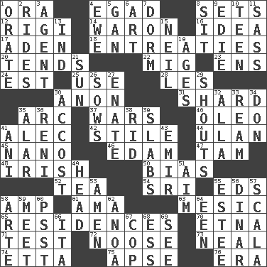ACROSS 1. Mouth or opening 4. Mild oath 8. Puts into a specified state 12. Swiss mountan, "Queen of the Mountains" 14. Make _____ (do battle with) 16. The content of cognition 17. An important port of Yemen 18. Pleas 20. Is inclined (to) 22. Russian fighter aircraft 23. Followers of ems 24. Eastern Standard Time (abbr.) 25. Purpose 28. French article 30. At once, immediately (arch.) 31. Pottery fragment 35. Curve 37. Armed conflicts 40. Margarine 41. Actor Baldwin 42. Vertical member of a panel or frame 44. ____ Bator 45. Billionth: prefix 46. Dutch treat 47. Scottish cap 48. From or relating to Ireland 50. Prejudice 52. Afternoon social gathering 54. _ Lanka 55. Begley and Asner 58. Electrical Unit 61. Housemaid (var.) 63. Of or pertaining to a meson 65. Dwellings 70. Inactive volcano in Sicily 71. Trial 72. Trap for birds or small mammals 73. Anneal 74. Singer James 75. Domed church section 76. Epoch DOWN 1. Speak pompously 2. Amusement-park features 3. Rep 4. She-sheep 5. Separate the seeds from cotton 6. Nonscientific branch of learning 7. Dormintory (informal) 8. Be seated 9. Singer Brickell 10. Adolescent 11. Backtalk 13. Working for oneself (abbr.) 15. Famous astronaut Armstrong 19. Matures 21. Player for Phoenix 26. Sty mamas 27. Maternal 29. Yells 30. Buttonhole 32. Silent film actress Nazimova 33. 480, 500 or 516 sheets of paper 34. Spanish title 35. Having or resembling wings 36. Painter Guido (1575-1642) 38. To free from 39. Thick slices 41. Cuckoo 43. Arab leader 49. Froth on beer 51. Direct toward a target or goal 53. So be it 55. First name in cosmetics 56. Middle Eastern gold or silver currency 57. Any of the three canals of the cochlea 58. Johnson of "Laugh-In" 59. Confront 60. Inconspicuous attention getter 62. Small Philippine buffalo 64. Car or cant ending 66. Call ___ day 67. Police officer (slang) 68. Double-curved letter 69. Perceive with the eye