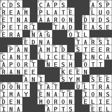 ACROSS 1. Music discs 4. Smile enhancers 8. Viper 11. 480, 500 or 516 sheets of paper 13. Food holder 15. Nilotic language 16. Inactive volcano in Sicily 17. Composer Copland 18. Movie discs 19. _ dish (used to culture cells) 21. Small boy 22. Comfort 23. Epoch 24. Tired old horse 27. Petroleum 29. Pulitzer Prize-winning author Ferber 30. Tarsus (plural) 34. Baking dish 36. Among 39. Guide 40. Patter 41. It is permitted: Lat. 43. South American Indian 44. To the left, to Queeg 46. Tender 47. Baseball player Mel 48. The wife of a rajah (variant) 49. Peachy ____! 51. Cuckoo 53. Symbol (abbr.) 54. Observe 57. Do not 60. Make lace 63. Extremist 65. "If ____ say so..." 66. Related on the mother's side 69. Charged particles 70. Lair 71. Person of subnormal intelligence 72. Writer Wiesel 73. _ tizzy (2 wds.) 74. Tenement units (abbr.) 75. Snakelike fish DOWN 1. Streamer paper 2. Prevent from occurring 3. Before Barbara or Clara 4. Accounting whiz (abbr.) 5. According to 6. Piece 7. Portico 8. Inventor's middle name 9. Soap bubbles 10. Airs 12. Impair 14. Inside; within (prefix) 18. Accusation by an informer 20. Working for oneself (abbr.) 25. Of or related to the anus 26. Street urchin 28. It is 29. Plea 31. Monthly bill 32. Religious group 33. Retirement account (abbr.) 34. Dad 35. At once, immediately (arch.) 37. Frozen water 38. Writing tables 40. Auto 42. Those people 45. Nine, plus one 50. Australian flightless bird 52. A distinct part 54. Took without asking 55. Bert's buddy 56. Artist's stand 57. "You Light Up My Life" star Conn 58. Sign of something about to happen 59. Nanny 61. Small Philippine buffalo 62. Canvas cover 64. Falsehood 67. Small child 68. Followers of ems