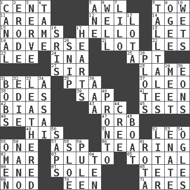 ACROSS 1. Penny 5. Leather borer 8. Pull behind 11. Type of rug 12. Famous astronaut Armstrong 14. Personal question 15. Typical models 17. Phone greeting 18. Allow 19. Contrary to your interests or welfare 21. Car dealer's back yard 22. French article 23. Area sheltered from the wind 24. _ tizzy (2 wds.) 25. Fitting 27. Title for a knight 28. Unable to walk 31. Actor Lugosi 35. Parent Teacher Association (abbr.) 37. Butter sub 38. Lyric poems 39. Plant excrement 41. Adolescent 42. Prejudice 43. Curve 45. Fast planes 46. Stalk of a moss capsule 47. Globe 49. Part of HMS, perhaps 51. Modern: prefix 52. Lion 55. Single 57. Viper 60. Pulling apart 62. Spoil 63. Cartoon dog 65. Add up to 66. Compass dir. 67. Not divided or shared with others 68. Wig 69. Dreamland 70. Car or cant ending 71. Ancient Greek god of war DOWN 1. Lessep's creation 2. Wear away 3. Boldness 4. Not wild 5. One (Scot) 6. Not ill 7. _ and Stitch 8. Baron Munchausen's specialties 9. Double curve, resembling the letter S 10. Moistens 13. Globular water bottle used in Asia 16. Indian titles of respect 17. Centers 20. Sever or remove by pinching or nipping 26. Small pieces of grounds 29. Confront 30. Immeasurably long periods of time 31. Moves up and down 32. Singer Brickell 33. Tough but pliablecoriaceous 34. Slender Brazilian palm 36. American Automobile Association (abbr.) 40. Right away 44. Algonquian 48. Water vessel 50. Plant excrements 52. 61 cubic inches 53. Maternal 54. Stares 55. Sign of things to come 56. Billionth: prefix 58. A type of plum 59. Whine 61. Round or rotation of duties 64. Nine, plus one
