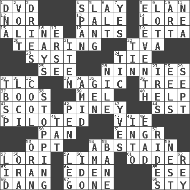 ACROSS 1. Movie disc 4. Kill 8. Flair 12. Not either 13. Diluted with white 14. Old wives' tales, e.g. 15. Place in a line 18. Pismires 19. Singer James 20. Pulling apart 22. Federal power corp. 23. System (abbr.) 24. Neckwear 25. Perceive with the eye 26. Simpletons 30. Affectionate concern, for short 33. Mysterious quality of enchantment 36. Family _ (genealogy) 37. Expressions of contempt or scorn 39. Cartoonist voice _ Blanc 40. Aid 41. Highlander 42. Abounding in pines 44. Fast jet (abbr.) 45. Manned the helm 47. Compete 50. Baking dish 51. Engineer (abbr.) 53. Elect 54. Refrain by choice 57. Australian parrot (variant) 59. Pale green bean 61. More peculiar 63. SW Asia republic 64. Genesis locale 65. Compass dir. 66. Mild oath, euphamism for damn 67. Went 68. Filthy place DOWN 1. Heredity factor (abbr.) 2. Electrical Unit 3. Frees from moisture 4. Connect, as a bridge 5. Austrian-born American filmmaker Fritz 6. Keyboard modifier key 7. Affirmative reply 8. Veterans Day date 9. Globular water bottle used in Asia 10. Tate display 11. Teachers' org. 16. Negative votes 17. Celtic language 21. A whole individual unit 22. Shallow baking pan 24. Nervous spasm 26. "Death on the ____" 27. Angers 28. Snakelike fish 29. Back-to-school mo. 30. Cook's measure (abbr.) 31. Locales 32. Calm and collected 34. Among 35. Commissioned military rank (abbr.) 38. Discontinuing 42. Writing instrument 43. Jacques Cousteau's middle name 46. Make lace 48. To the inside or interior of 49. Mild oath 52. Amusement-park features 53. Northwest Algerian city 54. So be it 55. Object of repulsion 56. Egg locale 57. Hat (slang) 58. Mouth or opening 59. Part of a journey 60. Wedding promise 62. Marina Del _, California