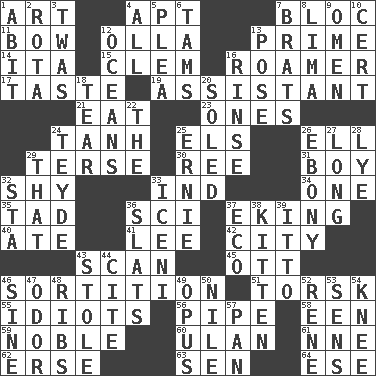ACROSS 1. Nonscientific branch of learning 4. Fitting 7. Alliance 11. Ribbon knot 12. Spanish pot 13. A-one 14. Call ___ day 15. Clement's nick name 16. Wanderer 17. Clothes sense 19. Aide 21. Ingest 23. Washington bills 24. Hyperbolic tangent 25. Raised railways 26. Pipe bend 29. Laconic 30. To riddle 31. Male child 32. Like a shrinking violet 33. Working for oneself (abbr.) 34. Single 35. Small boy 36. _-fi 37. Supplementing with great effort 40. Had dinner 41. Area sheltered from the wind 42. Municipality 43. Skim 45. Baseball player Mel 46. Conclusion 51. Cod relative 55. Foolish or stupid persons 56. Corncob 58. Car or cant ending 59. Having high moral qualities 60. ____ Bator, Mongolia 61. Compass dir. 62. Celtic language 63. Elected rep. 64. Compass dir. DOWN 1. "This won't hurt ____!" 2. Round or rotation of duties 3. It was, poetically 4. 100% 5. Entreaty 6. Scottish caps 7. Naughty children 8. Pale green bean 9. Sign of things to come 10. Certainty 12. Seas 13. Introduce or present, as a question 16. Remove soap 18. Lacerate 20. Having a sole or soles 22. Definite Article 24. Miss Universe 1986, Barbara Palacios _ 25. Bert's buddy 26. Black 27. Protracted 28. Potassium hydroxide 29. Not this but _ 32. R.R. building 33. Ancient Celtic tribe of eastern Britain 36. Narrow boards 37. Environmental prefix 38. Baby cat 39. "Tell ____ the Marines!" 43. Took without asking 44. Quote 46. Trig term 47. Scent 48. Teases 49. Musical composition 50. The longest river in the world 52. French philosopher Descartes 53. Elected reps. 54. Leg joint 57. Baking dish