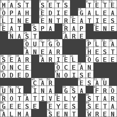 ACROSS 1. Vertical spar for supporting sails 5. Puts into a specified state 9. Wig 13. Brightly colored fish 14. Singer Brickell 15. An organ shaped like a helmet 16. Actor's bit 17. Pleas 19. Consume 20. Health resort 21. Reproach for some lapse or misdeed 22. Compass dir. 23. Political cartoonist Thomas 25. "We ___ not amused" (Victoria) 26. Expenditure 30. Entreaty 34. Approach 35. Command 36. Scorch 39. Satellite of Uranus 42. Double curve, resembling the letter S 43. Single time 44. Sea 46. Wrote a lyric poem 47. Annoying sound 48. 4-wheeled motor vehicle 51. Son of Isaac 54. Single; one (prefix) 57. _ tizzy (2 wds.) 58. Girls' org. (abbr.) 60. From 62. Happening in regular succession 65. Play the lead 66. Honkers 67. Snake ____ (dice throw) 68. Bristle 69. _ mater 70. Emitted 71. Songbird DOWN 1. Undercover agent 2. Bee-related 3. Before Barbara or Clara 4. Definite Article 5. Ooze 6. Pulitzer Prize-winning author Ferber 7. Teat (slang) 8. Father Junipero _ 9. Make lace 10. Writer Wiesel 11. Adolescent 12. Comfort 15. Stare wonderingly 18. Ewer handle 20. Surprise greatly 24. Flew 27. Afternoon social gathering 28. Slender fish 29. Greek mythologigal hunter 30. Gives a jingle 31. Part of a journey 32. Compass dir. 33. Had dinner 36. "Barney Miller" actor Jack 37. Conclude 38. Adept person 40. Environmental prefix 41. Luau accessory 45. Toward the sea 48. Quote 49. Cuckoo 50. All-night dance parties 52. Following 53. A salt of uric acid 54. Capital and largest city of Mongolia 55. Christmas carol 56. Detail 58. Small, secluded valley 59. System (abbr.) 61. Northwest Algerian city 63. White ___ sheet 64. Sight organ 65. Compass dir.