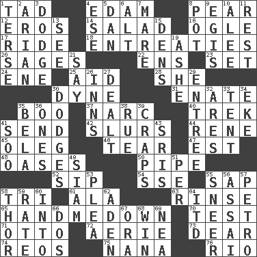 ACROSS 1. Bit 4. Dutch treat 8. Lightbulb-shaped fruit 12. Greek god of love 14. First course 16. Stare at amorously 17. Travel on or in a vehicle 18. Pleas 20. Gurus 22. Followers of ems 23. Arrange properly for use 24. Compass dir. 25. Help 28. A female animal or person 30. Centimeter-gram-second unit of force 31. Maternal 35. Surprise greeting 37. Drug cop 40. Long journey 41. Post 42. Disparaging remarks 44. French philosopher Descartes 45. Cassini of fashion 46. Pull into pieces 47. Eastern Standard Time (abbr.) 48. Fertile tracts in a desert 50. Corncob 52. Small drink 54. Compass dir. 55. Plant excrement 58. Three (prefix) 61. Chicken ___ king 63. Remove soap 65. Sleeping bag shop? 70. Trial 71. Von Bismarck 72. Nest on high 73. Letter starter 74. Vintage cars 75. Grandmother 76. River (Sp.) DOWN 1. Laconic 2. Believer in; advocate of (suffix) 3. Evade 4. Compass dir. 5. Daniel's nick name 6. The first octave above the treble staff 7. Female horse 8. Cooking vessel 9. The front part of a cuirass 10. Toward shelter 11. Remainder 13. Perceive with the eye 15. Hiding places for outlaws 19. American tennis player Robert 21. Declare 26. Taverns 27. Started a card game 29. Main course 30. Evades 32. Ancient Greek god of war 33. Portable shelter 34. Make supply last 35. Actor Lugosi 36. Washington bills 38. Sorrow 39. Dice game 41. "Barney Miller" actor Jack 43. Indian titles of respect 49. Thailand, formerly 51. For each 53. Entreaty 55. Contemptuous expression 56. Slender Brazilian palm 57. Stone: prefix 58. Son of Odin 59. Pace 60. To the inside or interior of 62. Arabian gulf 64. It would 66. Two (Sp.) 67. Mouth or opening 68. Acquire through effort 69. Teachers' org.