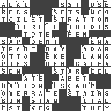 ACROSS 1. Mountain range southwest of Kyrgyzstan 5. Fast jet (abbr.) 8. Purpose 11. Confederate soldiers (slang) 12. Puts into a specified state 13. Non-commissioned officer (abbr.) 14. Bathroom plumbing fixture 17. Ski resort town in Vermont 19. Cigar-shaped 21. Foolish or stupid persons 22. Lug 23. Animal enclosure 24. Plant excrement 27. Undesirable depression on a surface 29. Epoch 32. Exchange 34. 24 hours 36. The sixth month of the Jewish calendar 37. Von Bismarck 38. Supplement with great effort 39. Austrian-born American filmmaker Fritz 40. Sliced desserts 41. Lair 42. An organ shaped like a helmet 43. Elected rep. 44. Play the lead 46. Snakelike fish 47. Had dinner 50. Collude with 52. Food allowance for one day 55. Fortification 57. Make much ado about nothing 59. Flight of steps 62. Storage container 63. Comedian Laurel of Laurel & Hardy 64. Slanted text style (abbr.) 65. Eastern Standard Time (abbr.) 66. Cask 67. Those people DOWN 1. Nonscientific branch of learning 2. Lion 3. "This won't hurt ____!" 4. Small island 5. Arrange properly for use 6. Remove all contents or possession from 7. Sadhe (variant) 8. To (old English) 9. Highlander 10. Immeasurably long periods of time 12. Compass dir. 15. Eat (away) 16. False hair 18. Metal container 20. Watched over 24. Obstructs or blocks passage 25. Nick name for Arthur 26. Eucharist need 28. Receives possession of 29. Peak District village in England 30. Indian princess (variant) 31. Therefore, facetiously 33. Two (Sp.) 35. Gossips 36. In the manner of 42. Relatively large 45. Lettered men learn these first 47. Wind 48. Cod relative 49. Maternal 51. Distinguishing feature 52. Loose flowing garment 53. Advice 54. Portable shelter 55. Car or cant ending 56. Essential or central part 58. Label 60. Actress Charlotte 61. Playfully artful