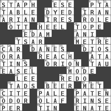 ACROSS 1. Staphylococcus 6. Compass dir. 9. Parent Teacher Association (abbr.) 12. Eating place 13. Colored 14. SW Asia republic 15. Believer in; advocate of (suffix) 16. Angers 17. Hero or heavy, e.g. 18. Baseball player Mel 19. Person who is morally reprehensible 20. Drink excessively 21. Dutch treat 23. Cuckoo 24. Russian ruler of old 25. Distance measurement (Brit.) 28. Auto 30. Natives or inhabitants of Denmark 34. "Vaya con ____" 35. Mouth or opening 36. Arrive at 38. "One Day ___ Time" 39. Airtight sealed metal containers 41. Constellation of myth 43. The 19th letter of the Greek alphabet 44. Artist's stand 46. Method 48. Area sheltered from the wind 49. Make new 50. Small boys 51. Fermented drink made from hops 53. Was introduced to 56. Quote 57. Light colored 58. Eucharist need 60. Scent 61. Norwegian king 62. Wash lightly 63. For each 64. Metal container 65. Related on the mother's side DOWN 1. R.R. building 2. Edible starchy tuberous root 3. "This won't hurt ____!" 4. Food holders 5. Layer 6. Jane of fiction 7. Stitch closed the eyes of (a falcon) 8. Begley and Asner 9. Conciliate 10. Falsehood 11. A saturated hydrocarbon 13. South Vietnam president (1954) 14. Pressed 19. Ethiopian city, capital of Harari 20. Scottish cap 22. June honoree 24. Interpreter 26. Round or rotation of duties 27. He sold his birthright 28. ____ d'Azur (French Riviera) 29. Roberta Peters solo 31. Modern: prefix 32. Ewer handle 33. _-fi 37. Simpsons dad 40. Sowing specialist 42. Dreamland 45. French article 47. Kingdom 49. Coral ridge 50. Event that recurs at intervals 51. Indonesian resort city 52. Style 54. Inactive volcano in Sicily 55. Trial 56. Police officer (slang) 57. Plant holder 58. Before (prefix) 59. Born