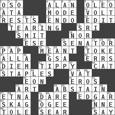 ACROSS 1. Bear (Spanish) 4. Actor Alda or Thicke 8. Margarine 12. _ moment's notice (2 wds.) 13. Method 14. Electrical Unit 15. Musical pauses 18. Inside; within (prefix) 19. Prepare for publication 20. Pulling apart 22. Indian title of respect (Mr.) 23. Stricken, poetically 24. Not either 25. Compass dir. 26. Legislator 30. Infant food 33. Intended 36. Casino tip 37. Silent film actress Nazimova 39. Girls' org. (abbr.) 40. Blunders 41. South Vietnam president (1954) 42. Likely to tip or tilt 44. Domesticated feline 45. Paper fasteners 47. Large container 50. Period of immesurable duration 51. Greek god of love 53. Nonscientific branch of learning 54. Choose not to consume 57. Inactive volcano in Sicily 59. Have the gumption 61. _ Allan Poe 63. Heroin 64. Double curve, resembling the letter S 65. Compass dir. 66. Lacquered or enameled metalware 67. Shrivel 68. Declare DOWN 1. Boat paddle 2. Proofreading order 3. Fertile tracts in a desert 4. So be it 5. Yearn 6. Find the sum of 7. Modern: prefix 8. Make much ado about nothing 9. Farming town in central California 10. Connecticut Ivy Leaguer 11. Baseball player Mel 16. Docile 17. Indian titles of respect 21. A distinct part 22. Male offspring 24. Fish or hair follower 26. Fastener 27. Torque (variant) 28. Gumbo ingredient 29. Take ten 30. Groovy apts. 31. Came down and settled, as after flight 32. Entreaty 34. Armor plate that protects the chest 35. Cleo's killer 38. Electrical Measurement 42. "___ Little Indians" 43. Jacques Cousteau's middle name 46. Car dealer's back yard 48. Johnson of "Laugh-In" 49. Frog relative 52. Public displays of written messages 53. Of or related to the anus 54. Length times width 55. Fermented drink made from hops 56. Nanny 57. Eastern Standard Time (abbr.) 58. Ring climax 59. Two (Sp.) 60. Grow older 62. Marina Del _, California