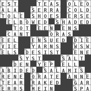 ACROSS 1. Eastern Standard Time (abbr.) 4. Beverages made from leaves 8. Butter sub 12. According to 13. Father Junipero _ 14. Lacking warmth 15. Lacquered or enameled metalware 17. Imelda's hoard 18. Celtic language 19. Shoved, as through a crowd 21. Cast a shadow over 23. Small child 24. Car or cant ending 26. Followers of ems 27. Patter 28. Mouths or openings 30. Snakelike fish 31. Took place subsequently 34. Pass on 37. Compete 38. Entertaining tales 39. Compass dir. 40. Raised railways 41. Stop 42. Compass dir. 43. System (abbr.) 44. Table seasoning 46. Lair 47. Slangy assent 50. Pipe bend 51. Remained 54. Deli grouping 57. French philosopher Descartes 58. Declaim 60. Singer Murray 62. Lacerate 63. Swept the length of 64. Slender fish 65. Blunders 66. Chow _ 67. Health resort DOWN 1. Erode 2. A type of plum 3. Baron Munchausen's specialties 4. Giggle 5. Eat (away) 6. "We ___ not amused" (Victoria) 7. Backtalk 8. Seas 9. Domineers 10. Otherwise 11. Wrote a lyric poem 13. Compass dir. 16. Inky black, to poets 20. Baseball player Mel 22. Froth on beer 25. Parts of speech 27. To provide with a ceiling 29. State of inaction 30. Night before a holiday 31. Snake ____ (dice throw) 32. Smutty 33. _ Lanka 34. Homes 35. Is not 36. She-sheep 41. Centimeter-gram-second unit of force 43. Spring feasts 44. Ocean 45. _ mater 46. Middle Eastern gold or silver currency 48. 1973 Nobel Price Winner (Physics) Leo 49. Eucharist need 51. Johnson of "Laugh-In" 52. Fermented drink made from hops 53. Dormintory (informal) 55. Directed 56. Fastener 59. Actress Charlotte 61. Period