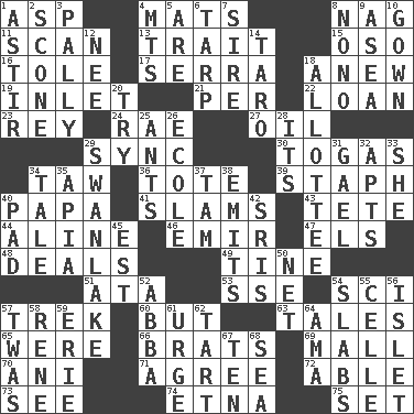 ACROSS 1. Cleo's killer 4. Floor protectors 8. Tired old horse 11. Examine minutely or intensely 13. Distinguishing feature 15. Bear (Spanish) 16. Lacquered or enameled metalware 17. Spanish missionary in California 18. Afresh 19. An arm off of a larger body of water 21. For each 22. Grant temporary use of 23. Marina Del _, California 24. Actress Charlotte 27. Lubricate 29. Synchronize (abbr.) 30. Ancient Roman robes 34. The 23rd letter of the Hebrew alphabet 36. Carryall 39. Staphylococcus 40. Dad 41. Shuts with force 43. Wig 44. Place in a line 46. Arab leader 47. Raised railways 48. Allots cards 49. Prong on a fork 51. "One Day ___ Time" 53. Compass dir. 54. _-fi 57. Long journey 60. With the exception that 63. Stories 65. We are 66. Naughty children 69. Shopping center 70. Black tropical American cuckoo 71. Match 72. Competent 73. Observe 74. Inactive volcano in Sicily 75. Put into a specified state DOWN 1. Being in motion 2. Biscuitlike quick bread 3. Chummy 4. Mountains (abbr.) 5. "We ___ not amused" (Victoria) 6. Canvas cover 7. Father 8. Words to Nanette 9. At sea 10. Woman's formal wear 12. Born 14. Edible starchy tuberous root 18. One to whom something is allotted 20. Attempt 25. Pismires 26. Learning spot: Fr. 28. It is 29. Tchaikovsky ballet 31. Highlander 32. Tenement units (abbr.) 33. A female animal or person 34. Story 35. Capital of Western Samoa 37. Scottish cap 38. Sends forth 40. Groovy apt. 42. Indian titles of respect 45. Eastern Standard Time (abbr.) 50. Remaining after all deductions 52. Swedish rock group 54. Broad, flat, thick pieces 55. Cell (Danish) 56. Small island 57. It was, poetically 58. French philosopher Descartes 59. 4th largest of the Great Lakes 61. Goad 62. Small pie 64. Nursemaid (var.) 67. "___ Little Indians" 68. Ocean