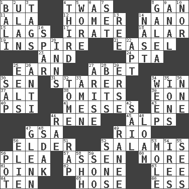 ACROSS 1. On the contrary 4. It was, poetically 8. Separate the seeds from cotton 11. Wing 12. Home run 14. Billionth: prefix 15. Falls behind 17. Feeling or showing extreme anger 18. Having or resembling wings 19. Heighten or intensify 21. Artist's stand 23. Added to 24. Parent Teacher Association (abbr.) 25. Merit 27. Collude with 30. Elected rep. 31. A viewer who gazes fixedly 34. Acquire through effort 37. Keyboard modifier key 38. Leaves out 39. Period of immesurable duration 40. 23rd letter of the Greek alphabet 41. Makes clutter 43. Compass dir. 44. French philosopher Descartes 45. High mountains 47. Girls' org. (abbr.) 49. River (Sp.) 50. A person who is older than you are 52. Deli grouping 56. Entreaty 57. NE Netherlands city 60. Greater amount 61. Pig sound 62. Give a jingle 63. Area sheltered from the wind 64. Nine, plus one 65. Flexible conduit 66. Curvy letter DOWN 1. Indonesian resort city 2. ____ Bator 3. Labels 4. One of three equal parts 5. Had on 6. Nursemaid (var.) 7. Arrange properly for use 8. An organ shaped like a helmet 9. Of or related to the anus 10. And not 13. To riddle 14. Political cartoonist Thomas 16. Coast Guard woman 20. Restaurants 22. Fitting 25. Snakelike fish 26. Against 27. Originate 28. Stakes 29. Celtic language 30. Plant excrement 32. Heavy book 33. So be it 34. Shed a tear 35. Charged atoms 36. Compass dir. 42. Travel by water 44. Actress Charlotte 46. Rich soil 47. American astronaut and politician John 48. Neighbor of Neb. 49. The wife of a rajah (variant) 50. Writer Wiesel 51. Strike 52. Elected reps. 53. Undercover agent 54. Angers 55. Observes 56. Plant holder 58. Quiet! 59. "Barney Miller" actor Jack