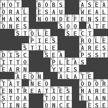 ACROSS 1. Being at a high temperature 4. Moves up and down 8. Toward the sea 12. Relating to the mouth 14. He sold his birthright 15. Welt 16. Cause to be 17. Unrelated to defense, as in spending 20. Singles 21. "Barney Miller" actor Jack 22. Had dinner 23. Fur scarf 27. Religious group 29. Sliced desserts 31. Hero or heavy, e.g. 34. Vertical member of a panel or frame 35. Ancient Greek god of war 36. Flat circle 39. Ocean 41. Inconspicuous attention getter 42. "Tell ____ the Marines!" 43. Entreaties 46. Merit 47. Jacques Cousteau's middle name 48. Period of immesurable duration 51. Having winglike extensions 54. Make lace 56. Modern: prefix 58. Scent 61. Pleas 66. Female horse 67. Portico 68. Lug 69. Flair 70. Prong on a fork 71. At one time in the past 72. Compass dir. DOWN 1. Like (prefix) 2. NW Algerian seaport 3. Receives possession of 4. Benjamin's nick name 5. Bear (Spanish) 6. Bar 7. Soap bubbles 8. Deep reverence 9. Elected representatives 10. 90 degrees 11. Toward shelter 13. For fear that 18. Greek goddess of the dawn 19. Enemy 24. Choose 25. Cards in a Roman deck? 26. Snakelike fish 28. Dice game 30. Not well drained, as in land 32. French article 33. Eastern Standard Time (abbr.) 34. Biscuitlike quick bread 36. Pass on 37. Call ___ day 38. Ski resort town in Vermont 40. Inventor's middle name 44. Snakelike fish 45. White ___ sheet 49. Single 50. Teachers' org. 52. Heavy book 53. Peak District village in England 54. Trial 55. Against 57. "Beetle Bailey" pooch 59. Mouths or openings 60. French philosopher Descartes 62. Actress Charlotte 63. Electrically charged atom 64. And so on (abbr.) 65. Observe