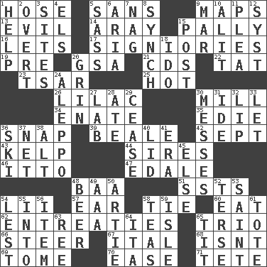 ACROSS 1. Flexible conduit 5. Without 9. Atlas contents 13. Tending to cause great harm 14. Like ___ of sunshine 15. Chummy 16. Allows 17. Seigniories (variant) 19. Before (prefix) 20. Girls' org. (abbr.) 21. Music discs 22. Make lace 23. Russian ruler of old 25. Being at a high temperature 26. Pale purple color 30. Place where flour is made 34. Related on the mother's side 35. Singer Brickell 36. Fastener 39. Memphis, Tenn. Street 42. Back-to-school mo. 43. Seaweed 44. Fathers 46. "Tell ____ the Marines!" 47. Peak District village in England 48. Sound made by sheep 51. Fast planes 54. Cards in a Roman deck? 57. Ewer handle 58. Standoff 60. Consume 62. Pleas 65. Musical group of three 66. Bull 67. Slanted text style (abbr.) 68. Is not 69. Heavy book 70. Comfort 71. False hair DOWN 1. Assist 2. Unconcealed 3. Locates 4. Raised railways 5. Backtalk 6. Roberta Peters solo 7. Tired old horse 8. Synchronize (abbr.) 9. Spoil 10. Came down and settled, as after flight 11. Entreaty 12. System (abbr.) 15. Mail 18. Wedding promise 20. Amused look 24. City in Syria 27. Experiment locale 28. Had dinner 29. Stop 30. Makes clutter 31. Binary compound 32. Mouth edge 33. Allow 36. What Jean-Claude Killy likes to do 37. Fish or hair follower 38. Keyboard modifier key 40. Hat (slang) 41. Epoch 45. Otherwise 48. Fermented drink made from hops 49. American Automobile Association (abbr.) 50. Nick name for Arthur 52. Laconic 53. Inhabitant of Heaven 54. For fear that 55. To the inside or interior of 56. A whole individual unit 58. Afternoon social gatherings 59. Capri or Wight 61. Lug 63. To sift 64. Call ___ day 65. Teat (slang)