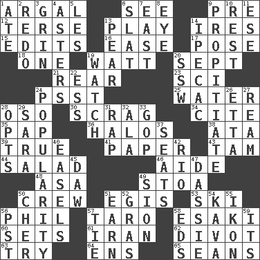 ACROSS 1. Therefore, facetiously 6. Perceive with the eye 9. Before (prefix) 12. Laconic 13. Frolic 14. Angers 15. Proofreads 16. Comfort 17. Airs 18. Single 19. Electrical Unit 20. Back-to-school mo. 21. Bring up, as a child 23. _-fi 24. Inconspicuous attention getter 25. Wetness 28. Bear (Spanish) 30. Lean end of the neck 34. Quote 35. Infant food 36. Saint headwear 38. _ moment's notice (2 wds.) 39. Loyal 41. Some stationery 43. Scottish cap 44. Vegetable dish 46. Assistant 48. White ___ sheet 49. Portico 50. Ship's personnel 51. Armor plate that protects the chest 53. What Jean-Claude Killy likes to do 56. Silvers or Donahue 57. Edible starchy tuberous root 58. 1973 Nobel Price Winner (Physics) Leo 60. Arranges properly for use 61. SW Asia republic 62. A piece of turf (Scot.) 63. Attempt 64. Followers of ems 65. Seines DOWN 1. Had dinner 2. Redecorate 3. Broad smile 4. Michaelmas daisies 5. French article 6. Narrow board 7. Compass direction 8. Sight organ 9. Conciliate 10. Repose 11. Compass dir. 13. Lightbulb-shaped fruit 14. Medicinal drug used to evoke vomiting 19. Timepiece 20. Compass dir. 22. Curvy letter 24. Teen's desire 26. Singer James 27. 480, 500 or 516 sheets of paper 28. Chooses 29. "Two Mules for Sister ____" 31. Strike 32. Insect wing 33. Republican Party 37. Theater features 40. Artist's stands 42. River (Sp.) 45. Fool 47. Small ungulate mammals of Africa 49. The Jewish people; Israel 50. "Mermaids" star 51. Merit 52. Pate de foie ____ 54. Polynesian shrub of the pepper family 55. Picture 56. Pacific Standard Time (abbr.) 57. Make a knot 58. Begley and Asner 59. ___ a Wonderful Life