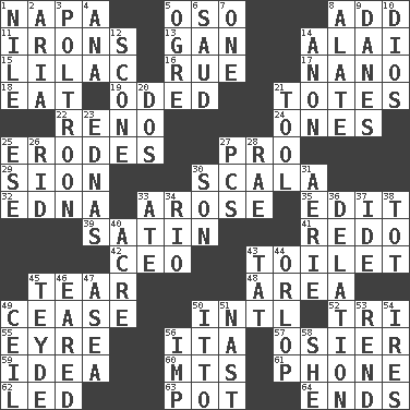 ACROSS 1. California wine valley 5. Bear (Spanish) 8. Find the sum of 11. Removes the wrinkles 13. Separate the seeds from cotton 14. Mountain range southwest of Kyrgyzstan 15. Pale purple color 16. Regret 17. Billionth: prefix 18. Ingest 19. Wrote a lyric poem 21. Hauls 22. Western Nevada city 24. Singles 25. Eats (away) 27. Adept person 29. The Jewish people; Israel 30. Any of the three canals of the cochlea 32. Pulitzer Prize-winning author Ferber 33. Came up 35. Prepare for publication 39. Smooth fabric 41. Redecorate 42. Corporate head (abbr.) 43. Rest room 45. Separate forcefully 48. Type of rug 49. Desist 50. International (abbr.) 52. Three (prefix) 55. Jane of fiction 56. Call ___ day 57. Flexible twig of a willow tree 59. The content of cognition 60. Mountains (abbr.) 61. Give a jingle 62. Directed 63. Cooking vessel 64. Conclusions DOWN 1. Mediterranean tributary 2. Roberta Peters solo 3. Characterized by complete cowardliness 4. Santa ___, CA 5. Legendary monster 6. Saudi Arabian king (1953-1964) 7. Single 8. Having winglike extensions 9. Natives or inhabitants of Denmark 10. "Vaya con ____" 12. Biscuitlike quick bread 14. At once, immediately (arch.) 20. Two (Sp.) 21. Utensil 23. Ferber et al. 25. Compass dir. 26. To free from 27. Personal Computers (abbr.) 28. Actress Charlotte 30. Manchild 31. Nest on high 33. Had dinner 34. _ de Janeiro 36. Accusation by an informer 37. Binary compound 38. Small child 40. Land measure 43. Make lace 44. Fourth or lowest deck 45. Miss Universe 1986, Barbara Palacios _ 46. Having ears or earlike features 47. Toward the sea 49. To provide with a ceiling 50. "Tell ____ the Marines!" 51. Political cartoonist Thomas 53. Tear apart 54. Angers 56. Mischievous child 58. A female animal or person