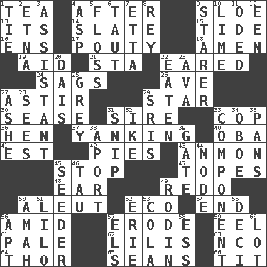 ACROSS 1. Afternoon social gathering 4. Following 9. _ gin 13. ___ a Wonderful Life 14. Chalkboard 15. Periodic rise and fall of the sea level 16. Followers of ems 17. Marked by pouting 18. So be it 19. Assist 21. R.R. building 22. Having ears or earlike features 24. Droops 26. "___ Maria" 27. Moving or stirring 29. Play the lead 30. Gospel singer Marvin 31. Father 33. Police officer (slang) 36. Layer 37. Pulling suddenly and vigorously 40. Chief or king in Benin or Nigeria 41. Eastern Standard Time (abbr.) 42. Sliced desserts 43. ID or VA city 45. Constrict 47. Drinks excessively 48. Ewer handle 49. Make new 50. Native American of Southwest Alaska 52. Environmental prefix 54. Conclusion 56. Among 57. Eat (away) 59. Snakelike fish 61. Diluted with white 62. Ms. Damita and namesakes 63. Non-commissioned officer (abbr.) 64. Son of Odin 65. Actors Connery and Penn 66. Teat (slang) DOWN 1. Standoff 2. Inactive volcano in Sicily 3. Aide 4. Viper 5. Soft thread for cleaning between teeth 6. Tense 7. Singer James 8. Marina Del _, California 9. A viewer who gazes fixedly 10. Citrus frut 11. Wrote a lyric poem 12. Car or cant ending 20. Raised platform 22. Consumed 23. Actress Gardner 25. Jennifer or Joel 27. American tennis player Robert 28. Observes 29. Indian titles of respect 31. Sever or remove by pinching or nipping 32. Mamie's husband 33. Part 34. Mitch Miller's instrument 35. Baking dishes 38. To the left, to Queeg 39. Yard entry 44. Method 45. Sowing specialist 46. The 19th letter of the Greek alphabet 49. "The Thinker" sculptor 50. Wet nurse 51. _ and Stitch 52. 4th largest of the Great Lakes 53. Root beer relative 55. Tenth: prefix 56. Fitting 57. Raised railways 58. Double-curved letter 60. Car dealer's back yard