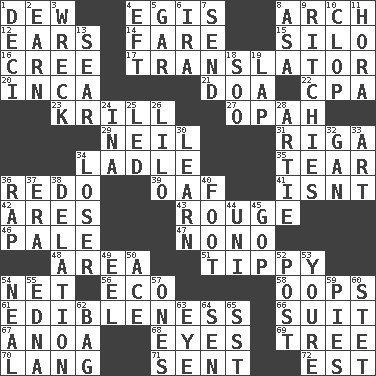 ACROSS 1. Morning condensation 4. The front part of a cuirass 8. Bowlike part 12. Hearing organs 14. Conductor's collection 15. Grain storage tower 16. Algonquian 17. Interpreter 20. South American Indian 21. ___ good deed 22. Numbers guy (abbr.) 23. Shrimp-like planktonic crustaceans 27. Brightly colored fish 29. Famous astronaut Armstrong 31. Capital of Latvia 34. Dipping utensil 35. Rend 36. Do over again 39. Clumsy lout 41. Is not 42. Ancient Greek god of war 43. Makeup applied to the cheeks 46. Diluted with white 47. Words to Nanette 48. Length times width 51. Likely to tip or tilt 54. Remaining after all deductions 56. Environmental prefix 58. I made a mistake 61. The property of being fit to eat 66. Set or collection 67. Small Philippine buffalo 68. Sight organs 69. Relationship diagram 70. Austrian-born American filmmaker Fritz 71. Emitted 72. Eastern Standard Time (abbr.) DOWN 1. Tenth: prefix 2. Merit 3. Raze 4. Lizard (obsolete) 5. Slender fish 6. Lyricist Gershwin 7. Post 8. White ___ sheet 9. Actors Guy, Robert Welles, and Clint 10. Hoof sound 11. Israeli folk dance 13. Wither 18. "Barney Miller" actor Jack 19. Pet locale 24. _ tizzy (2 wds.) 25. Directed 26. _ and Stitch 28. Nick name for Arthur 30. Acquire or gain knowledge or skills 32. Separate the seeds from cotton 33. Tate display 34. Failure 36. Reproach for some lapse or misdeed 37. Period 38. Conveyance 40. Lowest support of a structure 44. Single; one (prefix) 45. Grand Old Party 49. Snakelike fish 50. Adept person 52. Mail 53. You are 54. Anneal 55. Pulitzer Prize-winning author Ferber 57. Singles 59. Sliced desserts 60. Proofreading order 62. Container for groceries 63. Sight organ 64. Elected rep. 65. Fast jet (abbr.)