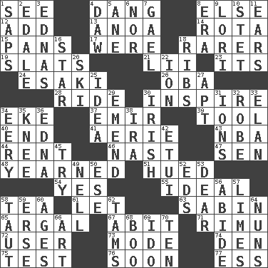 ACROSS 1. Observe 4. Mild oath, euphamism for damn 8. Otherwise 12. Increase 13. Small Philippine buffalo 14. Roll call or roster of names 15. Baking dishes 17. We are 18. More uncommon 19. Narrow boards 21. Cards in a Roman deck? 23. It is 24. 1973 Nobel Price Winner (Physics) Leo 26. Chief or king in Benin or Nigeria 28. Travel on or in a vehicle 30. Motivate 34. Make supply last 37. Independent ruler or chieftain 39. Utensil 40. Conclude 41. Nest on high 43. Basketball assoc. 44. Monthly bill 46. Political cartoonist Thomas 47. Elected rep. 48. Felt deep pity or tenderness 51. Became colored 54. Consenting reply 55. Perfect 58. Afternoon social gathering 61. Allow 63. Unit of acoustic absorption 65. Therefore, facetiously 67. "This won't hurt ____!" 71. Tall New Zealand timber tree 72. One who makes use of a thing 73. Method 74. Lair 75. Trial 76. Within a short period 77. Double-curved letter DOWN 1. Plant excrements 2. Peak District village in England 3. Ferber et al. 4. Obsolete 5. A saturated hydrocarbon 6. And not 7. Highlander 8. Period 9. Australian parrot (variant) 10. Proofreading order 11. Hearing organs 16. Play the lead 18. Chest bones 20. What Jean-Claude Killy likes to do 22. Electrically charged atom 25. The main thing one is thinking about 27. Fitting 29. Make improvements or corrections to 30. From or relating to Ireland 31. Charged atoms 32. Loose flowing garment 33. Style 34. Suggestive of the supernatural 35. Leg joint 36. Pulitzer Prize-winning author Ferber 38. Retirement account (abbr.) 42. Needle holder 45. Attempt 49. 1994 drama film starring Jodie Foster 50. Compass dir. 52. Begley and Asner 53. Letter starter 56. Tolerate 57. Citrus fruits 58. Tense 59. Celtic language 60. Eons 62. Scottish caps 64. Religious women 66. Tate display 68. Sometimes accompanies a hiss 69. Wedding promise 70. "___ Little Indians"