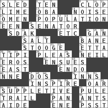 ACROSS 1. Downhill vehicle 5. Nine, plus one 8. Hoof sound 12. Citrus frut 13. Chief or king in Benin or Nigeria 14. Annoying sound 15. Presage 16. Census information 19. Car or cant ending 20. Elected representative 21. Neighbor of Neb. 23. And so on (abbr.) 24. Separate the seeds from cotton 27. Table seasoning 30. Object of repulsion 31. Moe Howard, for one 34. Singer James 35. Native american tent (variation) 38. Entreaties 40. Famous astronaut Armstrong 41. Greek god of love 42. Follows as a consequence or result 44. Compass direction 45. Inside; within (prefix) 46. Compass dir. 47. Two (Sp.) 50. Restaurants 53. Stimulate to action 57. Rowing implement 59. Supplementary 63. Whimper 64. Hang back 65. Baking dish 66. Pismires 67. Helper 68. Compass dir. 69. Inconspicuous attention getter DOWN 1. _ gin 2. Citrus fruits 3. Make improvements or corrections to 4. Lair 5. Drink excessively 6. Inky black, to poets 7. California wine valley 8. Small bed 9. Cards in a Roman deck? 10. Bear (Spanish) 11. Animal enclosure 14. Drug cop 17. Shoshoni 18. Car dealer's back yard 20. Three-handed card game 22. Help 24. Yard entry 25. Against 26. Actress Patricia 28. Trim (branches) 29. Lacquered or enameled metalware 30. Gillaume's butler role 32. Commissioned military rank (abbr.) 33. Comfort 35. Adolescent 36. SW Asia republic 37. Airs 39. Player for Phoenix 43. Singer Brickell 47. Deli pickle 48. Single 49. Fast jet (abbr.) 51. Parts of speech 52. Table seasonings 54. Corncob 55. "Terrible" tsar 56. French philosopher Descartes 58. Remainder 59. R.R. building 60. RI univ. 61. Writing tablet 62. Sliced dessert 63. Infant food
