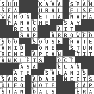 ACROSS 1. Quiet! 4. Polynesian shrub of the pepper family 8. Connect, as a bridge 12. Ocean 13. Mountain range 14. Otherwise 15. Make _____ (do battle with) 18. Singer James 19. California wine valley 20. Flamboyance 22. Declare 23. Former U.S. Attorney General Janet 24. Small island 25. Plant excrement 26. Moved like an arrow 30. "Barney Miller" actor Jack 33. Lush 36. Pace 37. Among 39. Single 40. Surprise greatly 41. French philosopher Descartes 42. Bee-related 44. Teat (slang) 45. Short socks 47. Sep. follower 50. White ___ sheet 51. Enthusiasm 53. Had dinner 54. Deli grouping 57. Indian skirt 59. The sixth month of the Jewish calendar 61. Confronts 63. Margarine 64. Observe 65. Head covering 66. Comedian Laurel of Laurel & Hardy 67. Raised platform 68. Epoch DOWN 1. Compass dir. 2. Pile 3. Ethiopian city, capital of Harari 4. Malaysian steamed pastry 5. Johnson of "Laugh-In" 6. Large container 7. Insect wing 8. Legislators 9. Frolic 10. Cleo's killer 11. Teachers' org. 16. Washington bills 17. Nanny 21. 911 reaches them 22. Title for a knight 24. "We ___ not amused" (Victoria) 26. Toward the sea 27. Electrical Unit 28. Needle case 29. Gouge 30. "Two Mules for Sister ____" 31. Presage 32. Pig sound 34. I made a mistake 35. University (slang) 38. Conveyance 42. "One Day ___ Time" 43. Christmas carol 46. Compass dir. 48. Dollar (slang) 49. Not wild 52. Sibling's daughter 53. Type of rug 54. Suttee (variant) 55. Ancient Greek god of war 56. Play the lead 57. Mayday 58. Keyboard modifier key 59. Plus 60. ___ good deed 62. Health resort