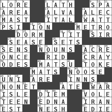 ACROSS 1. Old wives' tales, e.g. 5. Thin strip of wood or metal 9. Health resort 12. Type of rug 13. Inventor's middle name 14. Actor Baldwin 15. Vertical spar for supporting sails 16. Slanted text style (abbr.) 17. Electrical Unit 18. Air pressure measure (abbr.) 19. Electrically charged atom 21. Paris' subway 22. Dormintory (informal) 24. Teat (slang) 26. Title for a knight 27. Gospel singer Marvin 28. Arranges properly for use 29. Elected reps. 30. Parts of speech 32. Measure of real estate 36. At one time in the past 37. To free from 38. Supercomputer manufacturer 39. Lyric poems 40. Taiwanese island in East China Sea 42. Puff or smoke 43. Floor protectors 44. Trap for birds or small mammals 46. University (slang) 49. "We ___ not amused" (Victoria) 50. Restaurants 51. Music written for nine 53. Had dinner 54. Armed conflict 57. Capri or Wight 58. South Vietnam president (1954) 61. Short-tailed, large-bodied rat 62. Adolescent 63. Pulitzer Prize-winning author Ferber 64. SW Asia republic 65. Eastern Standard Time (abbr.) 66. Soft 67. Singer Brickell DOWN 1. Desk light 2. Mouths or openings 3. Dwelling 4. Consume 5. (Had) reclined 6. The first octave above the treble staff 7. Federal power corp. 8. Actor Linden 9. Narrow boards 10. _ dish (used to culture cells) 11. Thespian 14. Deep reverence 19. Big collection agency 20. Presage 21. Mountains (abbr.) 23. Fertile tracts in a desert 24. Watches over 25. ___ a Wonderful Life 27. Transmit 28. Sets or collections 29. "Barney Miller" actor Jack 31. Declaim 32. Gambison 33. What you're doing now 34. Immoral or dissolute person 35. Sight organ 40. Make imperfect 41. A single undivided whole 43. Floor protector 45. Single 46. Join together 47. Olfactory organs 48. An arm off of a larger body of water 52. Car or cant ending 53. Wet nurse 55. Mountain range southwest of Kyrgyzstan 56. French philosopher Descartes 58. Lair 59. Binary compound 60. Followers of ems 61. Compete