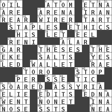 ACROSS 1. Petroleum 4. Smallest unit of an element 8. Inactive volcano in Sicily 12. "We ___ not amused" (Victoria) 13. Sports stadium 14. SW Asia republic 15. Located in or toward the back 17. One who wires 18. Small pie 19. Paper fasteners 21. Value system 23. Part of HMS, perhaps 24. Allow 26. Snakelike fish 27. Painter Guido (1575-1642) 28. Having or resembling wings 30. Slender fish 31. College papers 34. Definite Article 37. Supplement with great effort 38. Table seasonings 39. It is so 40. Directed 41. Place for singles 42. Actress Charlotte 43. "Corrida" creature 44. Discontinue 46. For each 47. Compass dir. 50. Nervous spasm 51. Flew 54. Nineveh was its capital 57. Writer Wiesel 58. Proofreads 60. Pulitzer Prize-winning author Ferber 62. Gone 63. Music written for nine 64. _ tizzy (2 wds.) 65. Sense of smell 66. Fast planes 67. Teachers' org. DOWN 1. Rowing implement 2. Angers 3. Resembling or made to resemble leather 4. Satellite of Uranus 5. Laconic 6. Single 7. Female horse 8. One or the other 9. Go after with the intent to catch 10. Drug cop 11. Pismires 13. Leather borer 16. Precipitation 20. Air pressure measure (abbr.) 22. Afternoon social gatherings 25. Clothes sense 27. Immoral or dissolute person 29. For fear that 30. Set 31. Russian ruler of old 32. Auras 33. Pipe bend 34. Polypeptide antibiotic 35. Pile 36. Compass dir. 41. Had on 43. Cylindrical with tapered ends 44. Filthy place 45. Become fatigued 46. Aches 48. Virtuous person 49. _____ Park, CO 51. Stitched 52. Butter sub 53. Habitations of wild animals 55. Fast jet (abbr.) 56. Queen of England 1702-14 59. Two (Sp.) 61. American Automobile Association (abbr.)