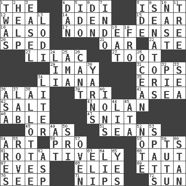 ACROSS 1. Definite Article 4. "You Light Up My Life" star Conn 8. Is not 12. Welt 14. An important port of Yemen 15. Letter starter 16. In addition 17. Unrelated to defense, as in spending 20. Moved rapidly 21. Rowing implement 22. Had dinner 23. Pale purple color 27. A blast of a horn 29. "If ____ say so..." 31. 911 reaches them 34. Climbing, woody, usually tropical vines 35. 4th largest of the Great Lakes 36. Mountain range southwest of Kyrgyzstan 39. Three (prefix) 41. Toward the sea 42. Table seasoning 43. Pitcher Ryan 46. Competent 47. In a ____ (agitated or irritated) 48. Mouths or openings 51. Actors Connery and Penn 54. Nonscientific branch of learning 56. Adept person 58. Elects 61. Rotating or pertaining to rotation 66. Strained 67. Nights before holidays 68. Writer Wiesel 69. Singer James 70. Ooze 71. Cuts off 72. Player for Phoenix DOWN 1. It was, poetically 2. Aid 3. Artist's stand 4. One of the 12 tribes of Israel 5. Wedding promise 6. Lair 7. _ china 8. Binary compound 9. Elected representatives 10. Political cartoonist Thomas 11. Relationship diagram 13. Farming town in central California 18. Consume 19. Back 24. Cards in a Roman deck? 25. Housemaid (var.) 26. Patter 28. Sea 30. Tall tales 32. Sliced dessert 33. Ocean 34. 61 cubic inches 36. White ___ sheet 37. Experiment locale 38. One to whom something is allotted 40. Charged particles 44. Untruth 45. "One Day ___ Time" 49. Fitting 50. Indian title of respect (Mr.) 52. Brief written record 53. Arguments over trivial matters 54. Ancient Greek god of war 55. Be footloose 57. Baking chamber 59. Ballerina skirt 60. Comedian Laurel of Laurel & Hardy 62. Cleo's killer 63. Connecticut Ivy Leaguer 64. Mouth edge 65. Consenting reply