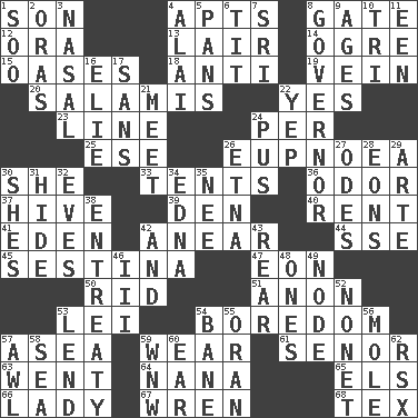 ACROSS 1. Boy, to dad 4. Tenement units (abbr.) 8. Yard entry 12. Mouth or opening 13. Den 14. Legendary monster 15. Fertile tracts in a desert 18. Opposed to 19. Distinctive style or manner 20. Deli grouping 22. It is so 23. Actor's bit 24. For each 25. Compass dir. 26. Normal relaxed breathing 30. A female animal or person 33. Portable shelters 36. Scent 37. Hub of activity 39. Lair 40. Monthly bill 41. Genesis locale 42. Approach 44. Compass dir. 45. French poetic form 47. A really long time 50. To free from 51. Soon (poet.) 53. Luau accessory 54. Mood resulting from idleness 57. At sea 59. Erode 61. Sir (Sp.) 63. Gone 64. Grandmother 65. Raised railways 66. Kenny Rogers chart-topper in '80 67. Songbird 68. John Ritter's dad DOWN 1. "Barney Miller" actor Jack 2. Mouths or openings 3. Rhinal 4. Mountain range southwest of Kyrgyzstan 5. Baking dishes 6. Teat (slang) 7. _ Lanka 8. Head of state? 9. Eons 10. Three (prefix) 11. Car or cant ending 16. Writer Wiesel 17. Without 21. Confront 22. Slangy assent 24. Fluid product of inflammation 26. Inactive volcano in Sicily 27. Lyric poems 28. Immeasurably long periods of time 29. Johnson of "Laugh-In" 30. "______ My Girl" (Turtles hit) 31. Flintstone garb 32. Nights before holidays 34. Pulitzer Prize-winning author Ferber 35. Born 38. Plea 42. Plus 43. Posterior 46. One more than two 48. Washington bills 49. Connecting point 52. Music written for nine 53. Grant temporary use of 54. Object of repulsion 55. NW Algerian seaport 56. Undercover agent 57. Leather borer 58. Ocean 59. Compass dir. 60. Ewer handle 62. Acura sports coupe