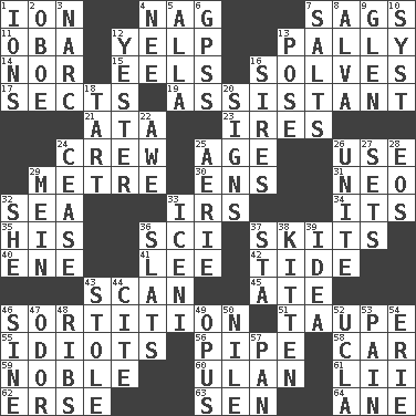 ACROSS 1. Electrically charged atom 4. Tired old horse 7. Settles 11. Chief or king in Benin or Nigeria 12. Sharp bark 13. Chummy 14. And not 15. Snakelike fish 16. Finds the solution 17. Religious groups 19. Helper 21. _ moment's notice (2 wds.) 23. Angers 24. Ship's personnel 25. Mature 26. Purpose 29. Distance measurement (Brit.) 30. Followers of ems 31. Modern: prefix 32. Ocean 33. Big collection agency 34. It is 35. Part of HMS, perhaps 36. _-fi 37. Burlesque acts 40. Compass dir. 41. Area sheltered from the wind 42. Periodic rise and fall of the sea level 43. Skim 45. Had dinner 46. Making a chance decision by using lots 51. Grayish beige 55. Foolish or stupid persons 56. Corncob 58. 4-wheeled motor vehicle 59. Impressive in appearance 60. ____ Bator, Mongolia 61. Cards in a Roman deck? 62. Celtic language 63. Elected rep. 64. One (Scot) DOWN 1. Charged particles 2. Mitch Miller's instrument 3. Drug cop 4. Born 5. Silent film actress Nazimova 6. Global Positioning Systems (abbr.) 7. Table seasonings 8. Inventor's middle name 9. Small, secluded valley 10. System (abbr.) 12. Of or pertaining to yesterday 13. Introduce or present, as a question 16. Titles for men of rank and authority 18. Small pie 20. Public displays of written messages 22. Deep reverence 24. Desist 25. Nest on high 26. Join together 27. Puts into a specified state 28. Greek goddess of the dawn 29. Count _ (2 wds.) 32. A female animal or person 33. Ancient Celtic tribe of eastern Britain 36. Narrow boards 37. R.R. building 38. Baby cat 39. The content of cognition 43. Fur scarf 44. Quote 46. Trig term 47. Aroma 48. Teases 49. Musical composition 50. The longest river in the world 52. Southern CA. univ. 53. Ache 54. 4th largest of the Great Lakes 57. Baking dish