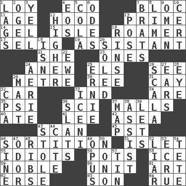 ACROSS 1. Myrna of the movies 4. Environmental prefix 7. Group of countries in special alliance 11. Ripen 12. Parka part 13. First class 14. Set 15. Small island 16. Nomad 17. Former Milwaukee Brewers owner Bud 19. Helper 21. A female animal or person 23. Singles 24. Afresh 25. Raised railways 26. Observe 29. Distance measurement (Brit.) 30. Portuguese money of account (variant) 31. Island 32. Automobile 33. Working for oneself (abbr.) 34. "We ___ not amused" (Victoria) 35. 23rd letter of the Greek alphabet 36. _-fi 37. Shopping centers 40. Had dinner 41. Area sheltered from the wind 42. Toward the sea 43. Skim 45. Pacific Standard Time (abbr.) 46. Determination 51. Small island 55. Foolish or stupid persons 56. Cooking vessels 58. Frozen water 59. Having high moral qualities 60. A single undivided whole 61. Tate display 62. Celtic language 63. Manchild 64. Regret DOWN 1. Fails to keep up a pace 2. Double curve, resembling the letter S 3. Shout 4. Greek goddess of the dawn 5. Root beer relative 6. Lyric poems 7. Naughty children 8. Pale green bean 9. Presage 10. Sure thing 12. Having greater elevation 13. Introduce or present, as a question 16. Wash lightly 18. Is not 20. Having a sole or soles 22. She-sheep 24. Nest on high 25. Bert's buddy 26. Any of the three canals of the cochlea 27. Hearing organs 28. Sight organ 29. Vertical spar for supporting sails 32. Numbers guy (abbr.) 33. Ancient Celtic tribe of eastern Britain 36. Narrow boards 37. Atlas unit 38. Help 39. Allows 43. Fur scarf 44. Quote 46. Trig term 47. Aroma 48. Chest bones 49. Musical composition 50. Words to Nanette 52. One who doesn't tell the truth 53. Shade of tan 54. False hair 57. Shallow baking pan