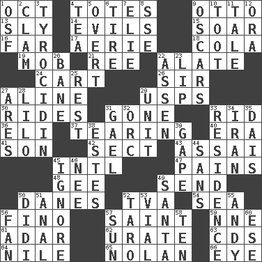 ACROSS 1. Sep. follower 4. Hauls 9. Von Bismarck 13. Cunning 14. Vices 15. Fly high 16. At a great distance 17. Nest on high 18. Root beer relative 19. Disorderly crowd 21. Portuguese money of account (variant) 22. Having winglike extensions 24. Draw slowly or heavily 26. Title for a knight 27. Place in a line 29. United States Postal Service (abbr.) 30. Amusement-park features 31. Went 33. To free from 36. Connecticut Ivy Leaguer 37. Pulling into pieces 40. Period 41. Male child 42. Religious group 43. Slender Brazilian palm 45. International (abbr.) 47. Aches 48. Turn to the right 49. Transmit 50. Natives or inhabitants of Denmark 52. Federal power corp. 54. Ocean 56. A pale, very dry sherry 57. Inhabitant of Heaven 59. Compass dir. 61. The sixth month of the Jewish calendar 62. A salt of uric acid 63. Music discs 64. Mediterranean tributary 65. Pitcher Ryan 66. Sight organ DOWN 1. Order of Saint Francis (abbr.) 2. Dollar (slang) 3. Polypeptide antibiotic 4. Beverage made from leaves 5. Unconcealed 6. Hoop that covers a wheel 7. Writer Wiesel 8. Compass dir. 9. Motion picture awards 10. A blast of a horn 11. Story 12. Mouth or opening 20. Object of repulsion 22. NE Netherlands city 23. Mouth edge 25. Repose 27. Ancient Greek god of war 28. _ and Stitch 29. A single undivided whole 31. Highlander 32. The grampus (Milton) 33. Dwelling 34. SW Asia republic 35. Raised platform 38. _____ Park, CO 39. Yawn 44. Without 45. Dismiss 46. Born 49. Before Barbara or Clara 50. "You Light Up My Life" star Conn 51. Of or related to the anus 52. Pacific island yam 53. Small bottle 55. Actor Griffith 56. Avid follower 57. Player for Phoenix 58. Nine, plus one 60. Compass dir.