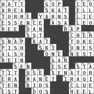 ACROSS 1. Electrical Unit 5. Republican Party 8. Corporate head (abbr.) 11. Type of rug 12. Three-handed card game 14. Pipe bend 15. Singer Mel 17. Tall tales 18. Untruth 19. Substance 21. White ___ sheet 22. Lion 23. To sift 24. One of the 12 tribes of Israel 25. Reproach for some lapse or misdeed 27. Fast jet (abbr.) 28. "Mermaids" star 31. Fastener 35. Krazy ___ of comics 37. Puff or smoke 38. Expression of disdain 39. What Jean-Claude Killy likes to do 41. Washington bills 42. In addition 43. Single 45. Egg locale 46. It's straight from the horse's mouth 47. Slender fish 49. Elected rep. 51. Compass dir. 52. R.R. building 55. Teat (slang) 57. Purpose 60. Legislator 62. Epoch 63. French painter Edouard 65. Resident of Iraq 66. Nine, plus one 67. Auction offers 68. A slight indication 69. Eastern Standard Time (abbr.) 70. Two (Sp.) 71. Person who is morally reprehensible DOWN 1. Wetness 2. Came up 3. Laconic 4. Docile 5. Girls' org. (abbr.) 6. Gumbo ingredient 7. Baking dishes 8. Portable communications device 9. Writer Wiesel 10. Butter sub 13. Russian ruler of old 16. Conclusions 17. Gossips 20. Keg 26. Gambison 29. Makes supply last 30. Take ten 31. Coast Guard woman 32. The longest river in the world 33. Helper 34. Give a jingle 36. Ring climax 40. Consume 44. Comfort 48. Painter Guido (1575-1642) 50. Unfeeling 52. Lacking originality or spontaneity 53. Woman's close-fitting hat 54. Satellite of Uranus 55. False hair 56. Angers 58. Expressed in words 59. Inside; within (prefix) 61. Bowlike part 64. Double-curved letter