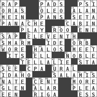 ACROSS 1. Hit sharply and swiftly 4. Groovy apts. 8. 23rd letter of the Greek alphabet 11. Mouths or openings 13. Margarine 14. ____ Jay Lerner 15. Count _ (2 wds.) 16. Zero-star reviews 17. Stalk of a moss capsule 18. Flamboyance 21. Small house or cottage 22. Live dramatic performance 23. Friend of Pooh 25. Compass dir. 26. Plant excrement 29. Veterans Day date 32. Excessive but superficial compliments 34. Binary compound 35. Globe 38. Had on 39. Saint headwear 41. Confront 43. It is 44. Pipe bend 45. Having high moral qualities 46. Copy Pinocchio 50. R.R. building 51. Perceive with the eye 54. Accounting whiz (abbr.) 55. Mountain range 57. Potato state 59. Deli grouping 63. Nathan's nickname 64. Penny 67. Greater amount 68. Small, secluded valley 69. Having or resembling wings 70. Entreaty 71. Car or cant ending 72. Capital of Latvia 73. Curvy letter DOWN 1. Play 2. Type of rug 3. Ache 4. Wimpy's pal 5. According to 6. Lair 7. Mayday 8. Cadet 9. Smooth fabric 10. Silly 12. Fastener 14. White ___ sheet 19. Clement's nick name 20. Actor Linden 21. Small bed 23. Make new 24. Washington bills 26. Compass dir. 27. Mine, in Marseilles 28. Role in a play 30. Country estate 31. Same (prefix) 33. Remainder 36. Confederate soldiers (slang) 37. Waist strap 39. Assist 40. Silent film actress Nazimova 42. Beverage made from leaves 45. Actress Patricia 47. Environmental prefix 48. A period of five years 49. Retirement account (abbr.) 51. Burn superficially 52. Peak District village in England 53. Ingested 56. Desk light 58. Layer 60. Undercover agent 61. Angers 62. Oceans 64. 4-wheeled motor vehicle 65. Biblical high priest 66. Tired old horse