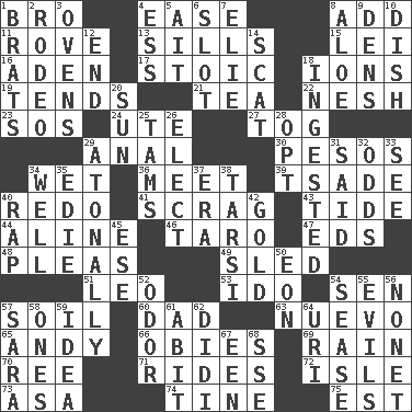 ACROSS 1. Sis' sibling 4. Relaxation 8. Say or write further 11. Be footloose 13. Beverly of Met fame 15. Luau accessory 16. An important port of Yemen 17. Unemotional 18. Charged particles 19. Watches over 21. Afternoon social gathering 22. Tender 23. Distress signal 24. Shoshoni 27. Coat; cloak 29. Of or related to the anus 30. Mexican monetary units 34. Soggy 36. Rendezvous 39. Sadhe (variant) 40. Redecorate 41. Strangle with an iron collar 43. Periodic rise and fall of the sea level 44. Place in a line 46. Edible starchy tuberous root 47. Begley and Asner 48. Entreaties 49. Downhill vehicle 51. Lion 53. Wedding promise 54. Elected rep. 57. The visible part of the earth's surface 60. June honoree 63. New (sp.) 65. "60 Minutes" Commentator Rooney 66. Off-Broadway awards 69. Water falling in drops from the sky 70. Portuguese money of account (variant) 71. Amusement-park features 72. Small island 73. White ___ sheet 74. Prong on a fork 75. Eastern Standard Time (abbr.) DOWN 1. Naughty children 2. Cowboy competition 3. Baking chambers 4. Curvy letter 5. Small island 6. Position in a hierarchy or organization 7. Writer Wiesel 8. Medicinal plant 9. Hiding places for outlaws 10. Food container 12. Conclude 14. Scram! 18. Swallowed 20. Player for Phoenix 25. Scottish caps 26. Choose 28. Choose 29. Without tonality 31. Alleged 32. Probability 33. Perceive with the eye 34. Not ill 35. Singer Brickell 37. Period 38. Tarsus (plural) 40. Hit sharply and swiftly 42. Precious metal 45. Compass dir. 50. A really long time 52. Scent 54. Gospel singer Marvin 55. Vices 56. Music written for nine 57. "Two Mules for Sister ____" 58. Singles 59. The content of cognition 61. "This won't hurt ____!" 62. "You Light Up My Life" star Conn 64. RI univ. 67. Car or cant ending 68. Compass dir.