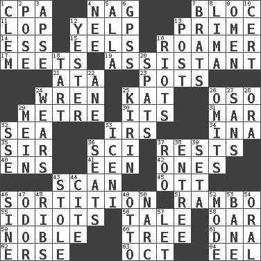ACROSS 1. Accounting whiz (abbr.) 4. Tired old horse 7. Coalition 11. Trim (branches) 12. Sharp bark 13. First class 14. Double-curved letter 15. Snakelike fish 16. Wanderer 17. Confronts 19. Aide 21. _ moment's notice (2 wds.) 23. Cooking vessels 24. Songbird 25. Krazy ___ of comics 26. Bear (Spanish) 29. Distance measurement (Brit.) 30. ___ a Wonderful Life 31. Spoil 32. Ocean 33. Big collection agency 34. _ tizzy (2 wds.) 35. Title for a knight 36. _-fi 37. Musical pauses 40. Followers of ems 41. Car or cant ending 42. Washington bills 43. Examine hastily 45. Baseball player Mel 46. Conclusion 51. Role for Stallone 55. Foolish or stupid persons 56. Falsehood 58. Boat paddle 59. Impressive in appearance 60. Family _ (genealogy) 61. Heredity factor (abbr.) 62. Celtic language 63. Sep. follower 64. Snakelike fish DOWN 1. Clement's nick name 2. Airs 3. Domed church section 4. Born 5. Silent film actress Nazimova 6. Global Positioning Systems (abbr.) 7. Naughty children 8. Pale green bean 9. Sign of things to come 10. Sure thing 12. Last past 13. Mail 16. Debaucheries 18. Small pie 20. Arguments over trivial matters 22. A saturated hydrocarbon 24. Puts on (as clothing) 25. Japanese brewing company 26. Leaves out 27. Without 28. Mouth or opening 29. Chow _ 32. Compass dir. 33. Ancient Celtic tribe of eastern Britain 36. Theater features 37. Friend of Pooh 38. Main course 39. Stalk of a moss capsule 43. Fur scarf 44. Quote 46. Trig term 47. Aroma 48. Teases 49. Von Bismarck 50. Drug cop 52. Method 53. Object of repulsion 54. Relating to the mouth 57. Allow