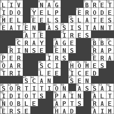 ACROSS 1. 54 in ancient Rome 4. Tired old horse 7. Cy Young winner Saberhagen 11. Wedding promise 12. Sharp bark 13. Eat (away) 14. Cartoonist voice _ Blanc 15. Snakelike fish 16. Chalkboards 17. Ingested 19. Aide 21. Had dinner 23. Angers 24. Supercomputer manufacturer 25. Grow older 26. English channel? 29. Remove soap 30. Followers of ems 31. Reproach for some lapse or misdeed 32. For each 33. Big collection agency 34. Epoch 35. Boat paddle 36. _-fi 37. Residences 40. Three (prefix) 41. Area sheltered from the wind 42. On the rocks 43. Examine minutely or intensely 45. Elected rep. 46. Making a chance decision by using lots 51. Slender Brazilian palm 55. Foolish or stupid persons 56. Ache 58. Keyboard modifier key 59. Having high moral qualities 60. Flats, for short 61. Actress Charlotte 62. Celtic language 63. Possessed 64. Direct toward a target or goal DOWN 1. Citrus frut 2. The content of cognition 3. Electrical Unit 4. Born 5. Silent film actress Nazimova 6. Global Positioning Systems (abbr.) 7. Naughty children 8. Round or rotation of duties 9. Paradise 10. Trial 12. Gossips 13. Otherwise 16. Male parents of animals 18. Merit 20. Signals 22. Sight organ 24. High-altitude cloud 25. Nest on high 26. A special lineage 27. Taverns 28. Numbers guy (abbr.) 29. Posterior 32. Cooking vessel 33. Ancient Celtic tribe of eastern Britain 36. Narrow boards 37. Part of HMS, perhaps 38. Seas 39. Not women's 43. Took without asking 44. Quote 46. Trig term 47. Aroma 48. Teases 49. Brightly colored fish 50. California wine valley 52. "Two Mules for Sister ____" 53. Jai _ 54. A whole individual unit 57. It would
