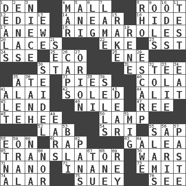 ACROSS 1. Lair 4. Promenade 8. Carrot, for example 12. Singer Brickell 14. Approach 16. Flintstone garb 17. Afresh 18. Complicated, petty procedures 20. Shoestrings 22. Supplement with great effort 23. Fast jet (abbr.) 24. Compass dir. 25. Environmental prefix 28. Compass dir. 30. Play the lead 31. First name in cosmetics 35. Had dinner 37. Sliced desserts 40. Root beer relative 41. Jai _ 42. Having a sole or soles 44. Set down 45. Grant temporary use of 46. The longest river in the world 47. To riddle 48. Giggle 50. Desk light 52. Experiment locale 54. _ Lanka 55. Plant excrement 58. A really long time 61. Reproach for some lapse or misdeed 63. An organ shaped like a helmet 65. Interpreter 70. Armed conflicts 71. Billionth: prefix 72. Lacking in sense or substance 73. Give off 74. Having or resembling wings 75. Chop _ 76. Observe DOWN 1. Allots cards 2. Ferber et al. 3. Sibling's daughter 4. Third mo. 5. Black tropical American cuckoo 6. Part of a journey 7. Unable to walk 8. 17th letter of the Greek alphabet 9. Lubricates 10. Lyric poems 11. Trial 13. She-sheep 15. Immoral or dissolute person 19. French philosopher Descartes 21. Put into a specified state 26. Balmoral and tarboosh 27. Greek mythologigal hunter 29. Fortification 30. Beer mug 32. Lacquered or enameled metalware 33. Writer Wiesel 34. Consume 35. Toward shelter 36. Hyperbolic tangent 38. Connecticut Ivy Leaguer 39. Makes a sale 41. The first octave above the treble staff 43. Letter starter 49. Hearing organs 51. Russian fighter aircraft 53. Indonesian resort city 55. Hits or strikes with great force 56. Nest on high 57. Thick mixture 58. Inactive volcano in Sicily 59. Relating to the mouth 60. Nanny 62. Zero-star reviews 64. Deep reverence 66. And not 67. The 19th letter of the Greek alphabet 68. Single 69. Marina Del _, California