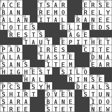 ACROSS 1. Adept person 4. Russian ruler of old 8. Celtic language 12. Forbid 13. San ____ (Riviera town) 14. Have trust in 15. Actor Alda or Thicke 17. Slanted text style (abbr.) 18. Indian princess (variant) 19. Hauls 21. Connecticut Ivy Leaguer 23. Begley and Asner 24. Musical pauses 26. Personal question 28. Tense 30. Curse 34. Writing tablet 37. Angers 39. Quote 40. Chicken ___ king 41. Clothes sense 43. Heredity factor (abbr.) 44. Without 46. Detail 47. Ewer handle 48. Having the greatest elevation 51. Grain storage tower 54. Actor Linden 55. Wash lightly 58. Personal Computers (abbr.) 61. Symbol (abbr.) 63. Allots cards 65. Upper-body garment 67. Baking chamber 71. Astound 72. "Two Mules for Sister ____" 73. Object of repulsion 74. Wedding promise 75. Relationship diagram 76. Proofreading order 77. ___ Haven, CT DOWN 1. Blind as ____ 2. Bodily heat indicating an inflammation 3. Maternal 4. Three (prefix) 5. Arrange properly for use 6. Housemaid (var.) 7. Hero or heavy, e.g. 8. Period 9. French philosopher Descartes 10. Downhill vehicle 11. Snake ____ (dice throw) 16. A home for chicks 18. Swiss mountan, "Queen of the Mountains" 20. R.R. building 22. Pet locale 25. Set or collection 27. And so on (abbr.) 29. Distinguishing feature 30. _____ Park, CO 31. Flintstone garb 32. Inactive volcano in Sicily 33. Pull apart 34. Romantic infatuation 35. Mountain range southwest of Kyrgyzstan 36. Mild oath, euphamism for damn 38. Eastern Standard Time (abbr.) 42. Arab leader 45. Quiet! 49. Compass direction 50. Insidious 52. Hat (slang) 53. Washington bills 56. Smooth fabric 57. Evade 58. Inconspicuous attention getter 59. Burn to charcoal 60. Beget 62. Crowds into 64. Frozen precipitation 66. Actress Charlotte 68. Large container 69. Compass dir. 70. Fish or hair follower