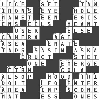 ACROSS 1. Louse (plural) 5. Arrange properly for use 8. The 23rd letter of the Hebrew alphabet 11. Removes the wrinkles 13. Sight organ 14. Hollow 15. French painter Edouard 16. Car or cant ending 17. The front part of a cuirass 18. Followers of ems 19. Snakelike fish 21. Intended 22. One who uses or employs something 24. Otherwise 25. Device for capturing images 27. Ripen 29. At sea 30. Related on the mother's side 32. Small amounts or degrees 33. Indian antelope 35. "____ silly question..." 39. Spew [out] 41. Proofreading order 42. Single 43. Develop 45. Become taut 48. Root beer relative 49. Columnist Joseph or Stewart 50. Parka part 52. Three (prefix) 55. Dunce 56. Lion 57. Keyboard key 59. Length times width 60. Naughty child 61. Biscuitlike quick bread 62. Floor covering 63. Curvy letter 64. Washington bills DOWN 1. Citrus frut 2. SW Asia republic 3. Eaten 4. Compass dir. 5. Stitch closed the eyes of (a falcon) 6. Snake ____ (dice throw) 7. Nine, plus one 8. Ancient Roman robes 9. Place in a line 10. Compass direction 12. Guide 14. Person who is morally reprehensible 20. Period 21. Confront 23. Gospel singer Marvin 25. Domesticated feline 26. White ___ sheet 27. Black tropical American cuckoo 28. Separate the seeds from cotton 30. Eastern Standard Time (abbr.) 31. Artist's stand 33. Player for Phoenix 34. Adept person 36. Ski resort town in Vermont 37. Cask 38. Had dinner 40. Frolic 43. Environmental prefix 44. Methods 45. Plants 46. Small island 47. Round or rotation of duties 49. First man 50. Folds over and sews together 51. I made a mistake 53. French philosopher Descartes 54. Angers 56. Falsehood 58. Non-commissioned officer (abbr.)
