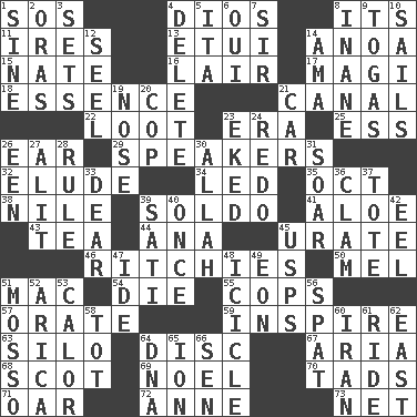 ACROSS 1. Distress signal 4. "Vaya con ____" 8. It is 11. Angers 13. Needle case 14. Small Philippine buffalo 15. Nathan's nickname 16. Den 17. Wise men 18. Core 21. Lessep's creation 22. Plunder 23. Period 25. Curvy letter 26. Ewer handle 29. Orators 32. Dodge 34. Directed 35. Sep. follower 38. The longest river in the world 39. Twentieth part of a lira 41. Medicinal plant 43. Afternoon social gathering 44. Santa ___, CA 45. A salt of uric acid 46. Actors Guy, Robert Welles, and Clint 50. Cartoonist voice _ Blanc 51. Apple computer (short form) 54. Pass on 55. 911 reaches them 57. Speak pompously 59. Heighten or intensify 63. Grain storage tower 64. Flat circle 67. Roberta Peters solo 68. Native of Scotland 69. Christmas carol 70. Small amounts or degrees 71. Boat paddle 72. Queen of England 1702-14 73. Remaining after all deductions DOWN 1. Trig term 2. Mouths or openings 3. Arranges properly for use 4. Keyboard key 5. Call ___ day 6. Fr. "Yes" 7. Title for a knight 8. Silly 9. Ancient Roman robes 10. Moves on water 12. Stitch closed the eyes of (a falcon) 14. Nursemaid (var.) 19. Characteristic smell of wine 20. Police officer (slang) 21. Automobile 23. Made supply last 24. Do over again 26. Car or cant ending 27. Came down and settled, as after flight 28. Court order 30. Assad's deity 31. Fly high 33. Letter starter 36. Burrowing marine mollusk 37. Carry 39. Suttee (variant) 40. At one time in the past 42. Snakelike fish 45. United States Postal Service (abbr.) 47. Binary compound 48. Hanging ice 49. Period of immesurable duration 51. With motion or animation 52. N. Chile seaport 53. Bodily heat indicating an inflammation 56. Petty quarrel 58. Small child 60. SW Asia republic 61. Travel on an animal 62. 90 degrees 64. Heredity factor (abbr.) 65. Electrically charged atom 66. Elected rep.